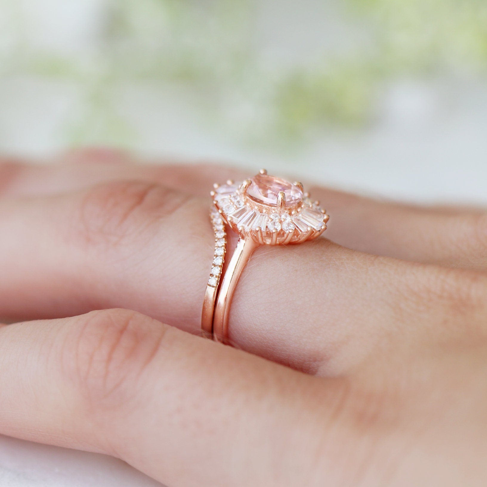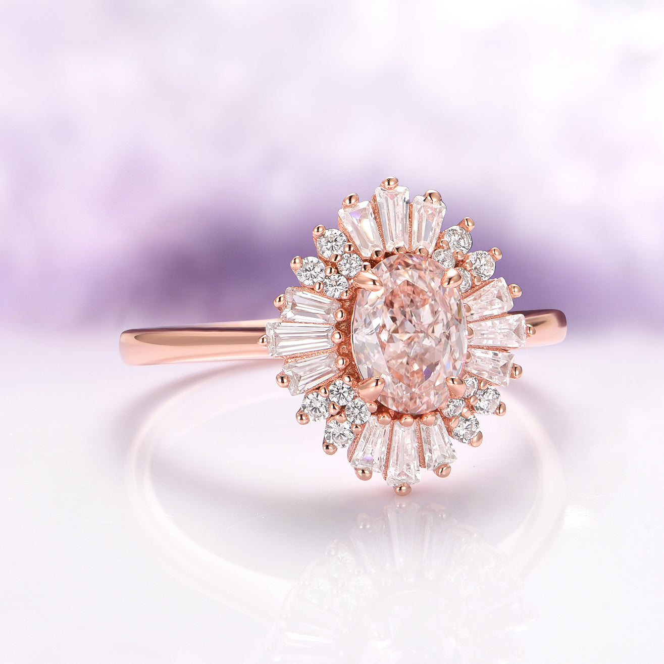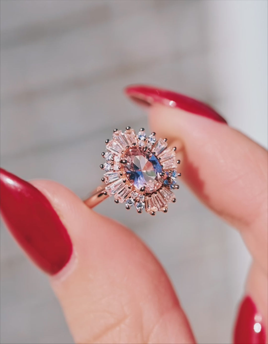 The Victoria Morganite Ring in 14K solid rose gold is a stunning vintage-inspired piece, featuring a captivating oval-cut natural morganite as its centerpiece. Encircled by brilliant moissanite accents, this ring exudes timeless elegance and romantic sophistication. The soft blush hue of the morganite symbolizes compassion, love, and emotional healing, while the warm rose gold band adds a graceful and feminine touch. With its radiant sparkle and vintage charm, this ring is perfect for an engagement, anniversary gift, or heirloom piece, ideal for those who appreciate elegant and non-traditional fine jewelry.