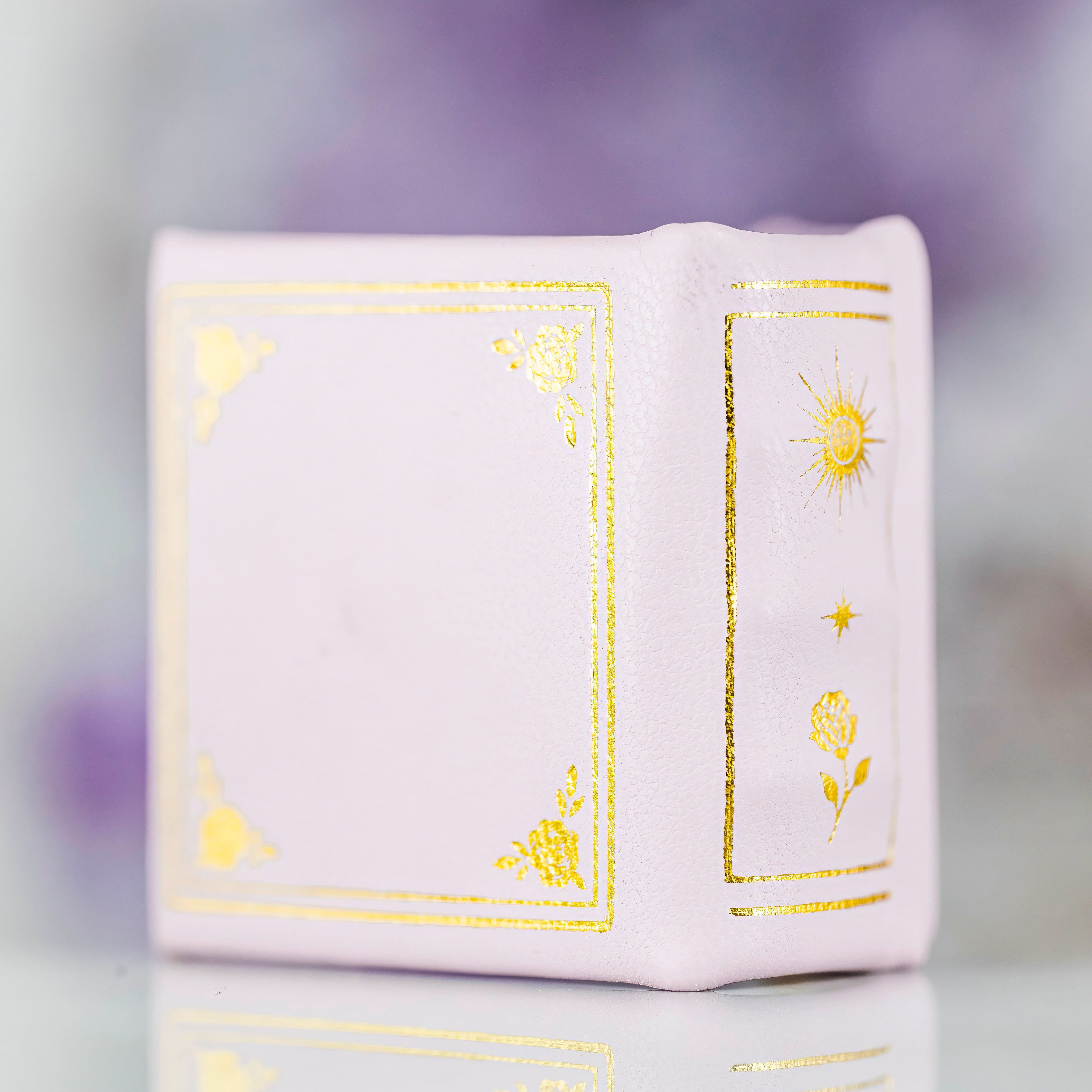 Soft as morning light and radiant as sunrise over the mountains of Prythian, the Blushing Dawn Edition celebrates love, light, and storybook romance. Inspired by the Dawn Court from A Court of Thorns and Roses, this handcrafted ring box is wrapped in blush pink vegan leather with gold celestial embossing — a perfect symbol of new beginnings.