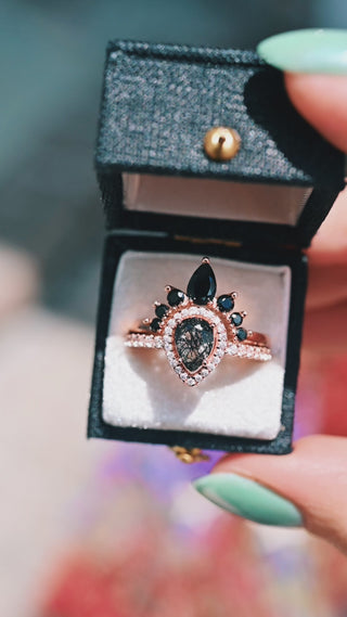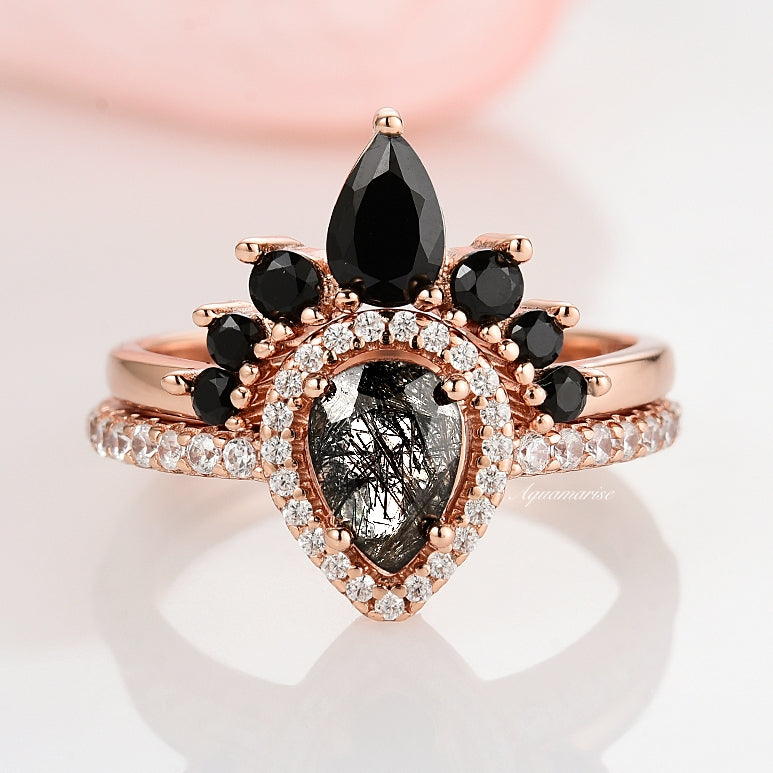 Amy Rutilated Quartz & Black Diamond (Onyx) Ring Set- 14K Rose Gold Vermeil