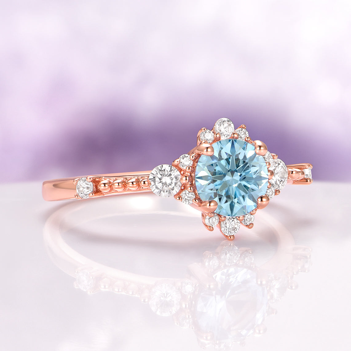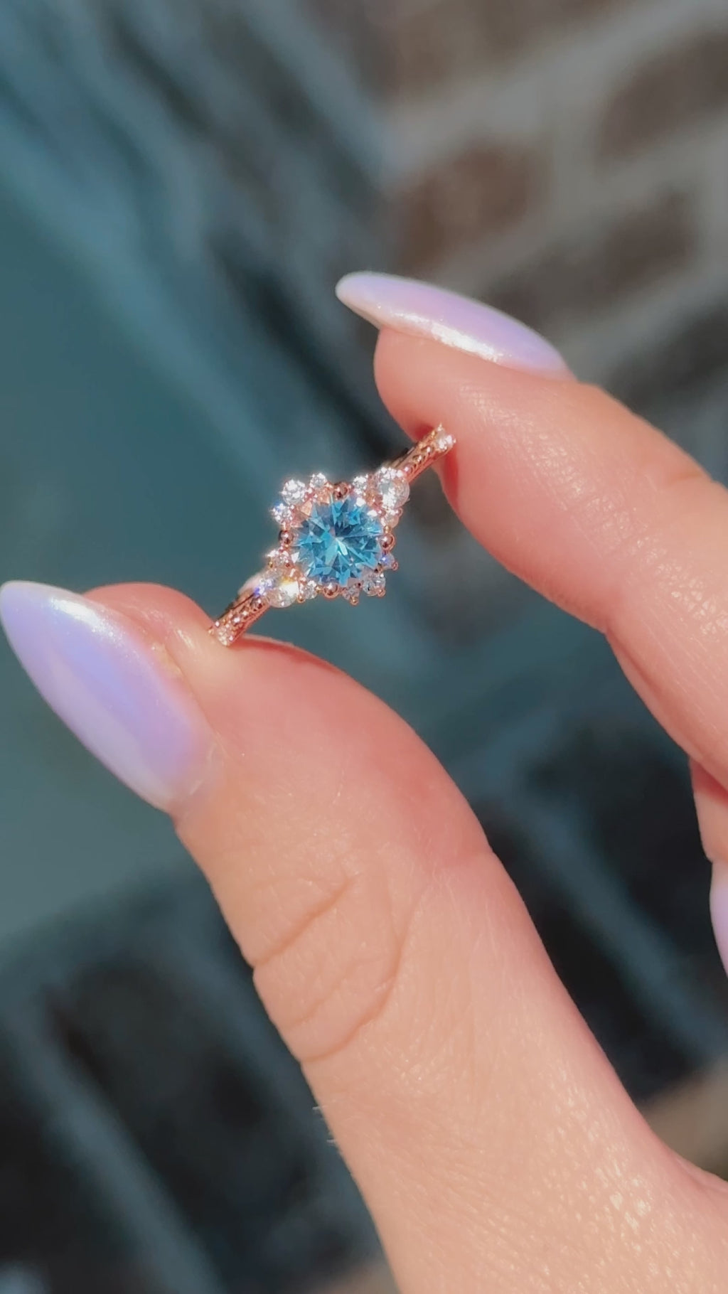 Gorgeous vintage inspired aquamarine ring is made of 14K rose gold over solid 925 sterling silver, making a simple but elegant statement piece. This ring is perfect to wear as engagement ring, promise ring, birthstone ring, or statement piece.