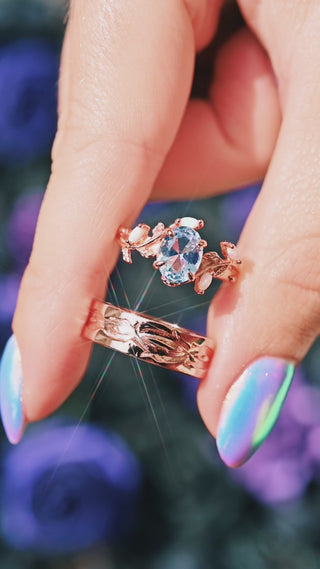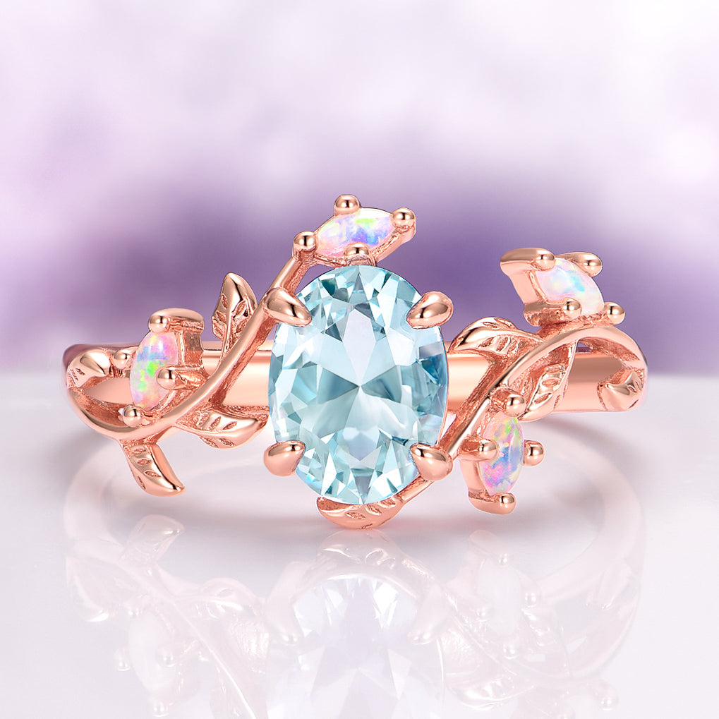 Unique and intricate piece of jewelry that combines the beauty of light blue aquamarine, Opal accents in the form of vines and leaves, and the luxurious appearance of 14k rose gold vermeil. This type of jewelry can make a statement and offer a connection to nature through its design elements.