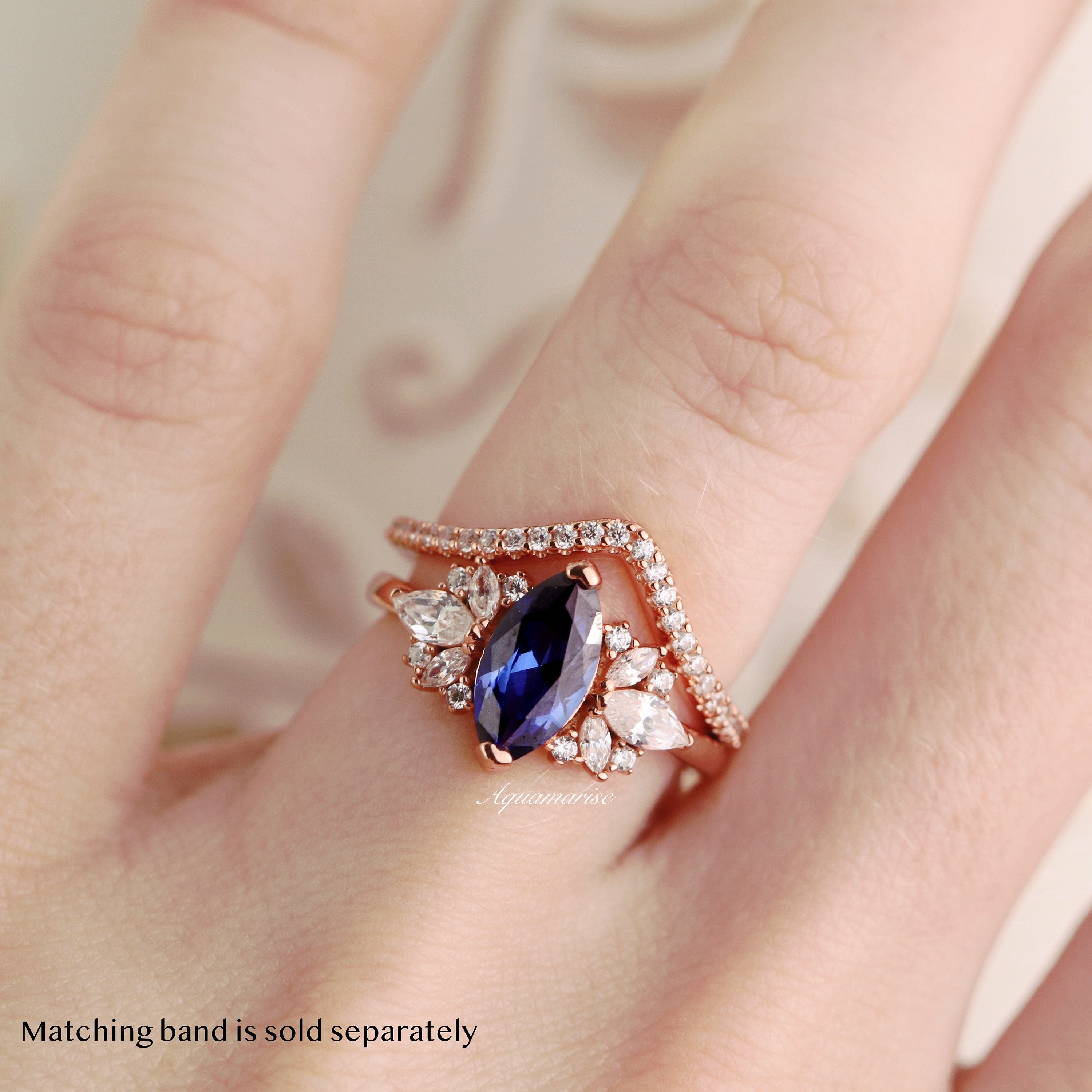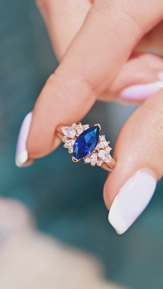 Crafted with a vibrant Ceylon blue marquise-cut lab-grown sapphire accented by sparkling simulated diamonds, this piece offers the brilliance of fine jewelry with lasting durability. Its rose gold vermeil finish adds a romantic warmth, making it a standout choice for brides who dream of a unique sapphire promise ring that feels like a modern heirloom.