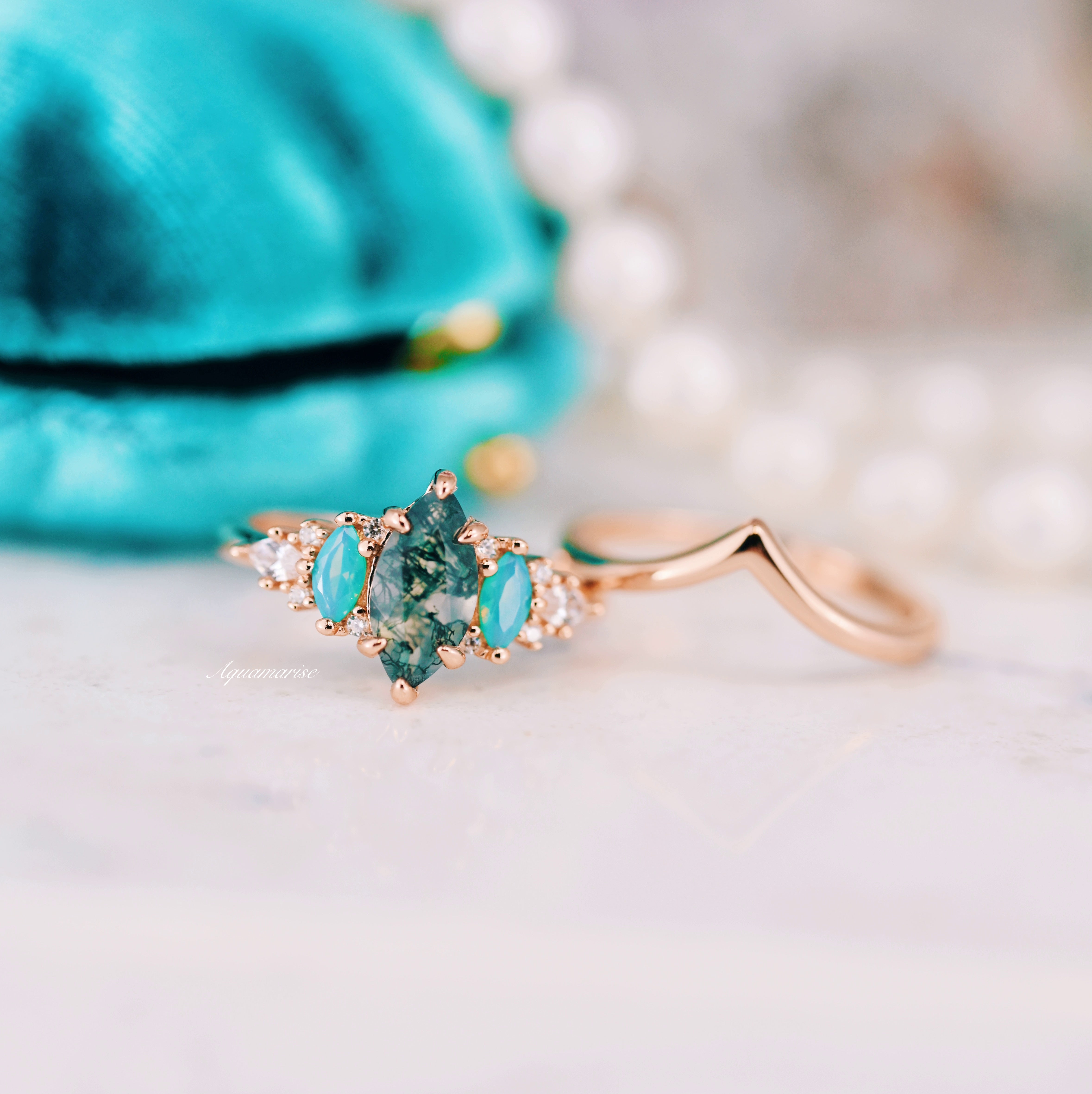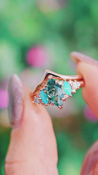 Emerie Marquise Cut Moss Agate & Opalescent Sapphire Ring Set in 14K Rose Gold Vermeil