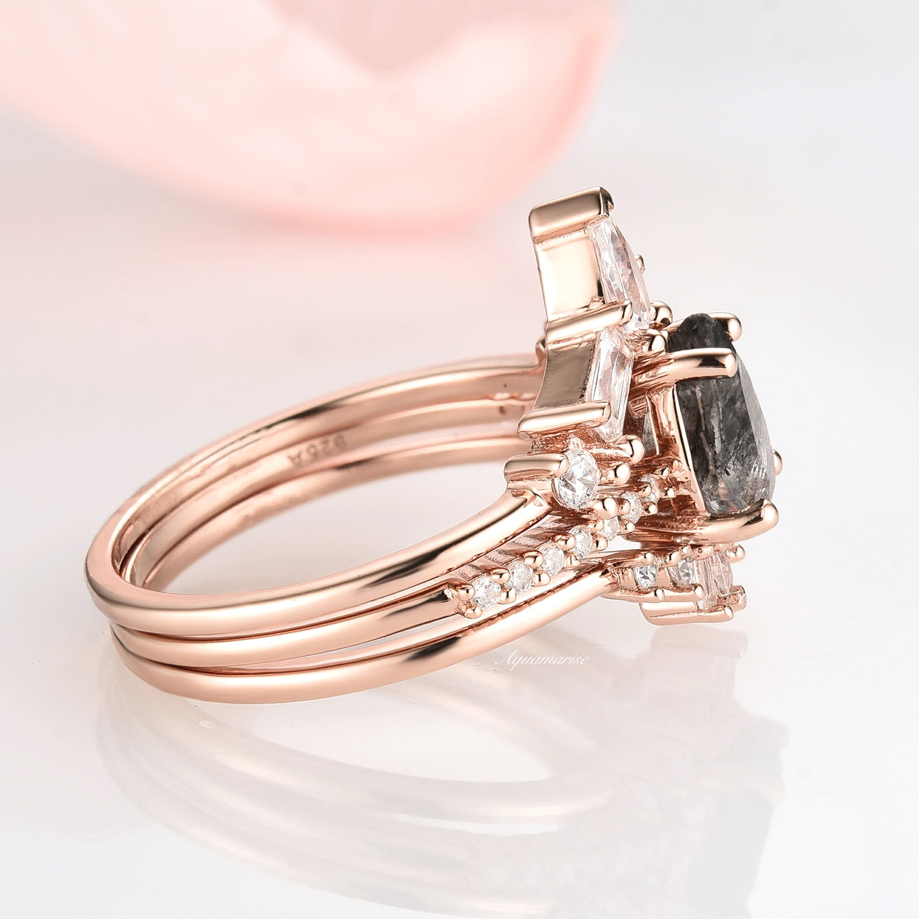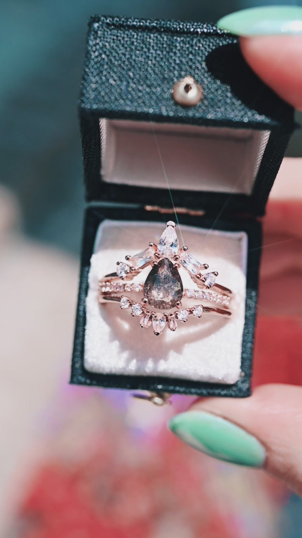 Gorgeous teardrop cut salt and pepper diamond ring set is made of 14K rose gold vermeil over 925 solid sterling silver, making a simple but elegant statement piece. This ring is perfect to wear as engagement ring, promise ring, birthstone ring, or statement piece.