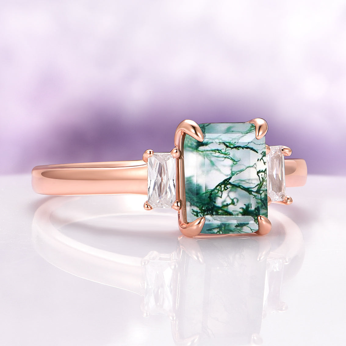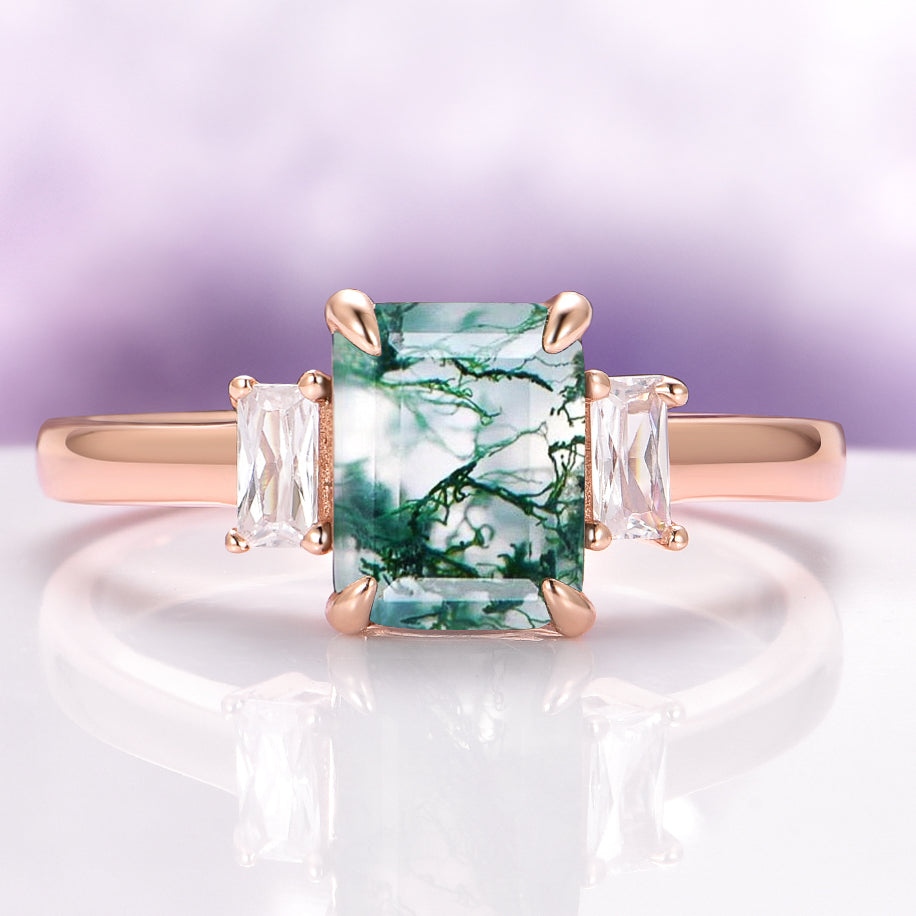 This stunning three-stone natural green moss agate ring captures the tranquil essence of nature. Set in 14K rose gold over solid 925 sterling silver, it blends simplicity with elegance — perfect as an engagement ring, promise ring, birthstone ring, or statement piece. Each moss agate stone is one-of-a-kind, featuring natural inclusions that resemble delicate greenery preserved within the gem.