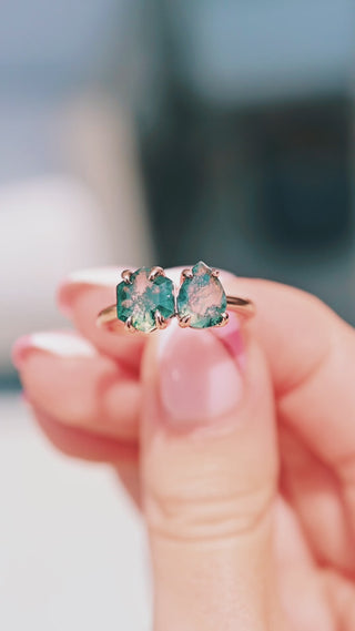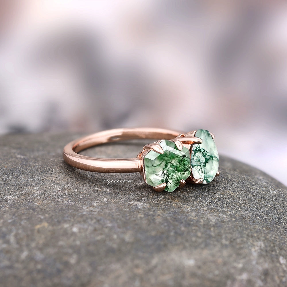 ►The 14K Rose Gold Vermeil setting adds a touch of warmth and sophistication, complementing the earthy tones of the moss agate. The Toi Et Moi style, meaning "You and Me" in French, symbolizes the union of two souls, making this ring an ideal choice for expressing love and connection.