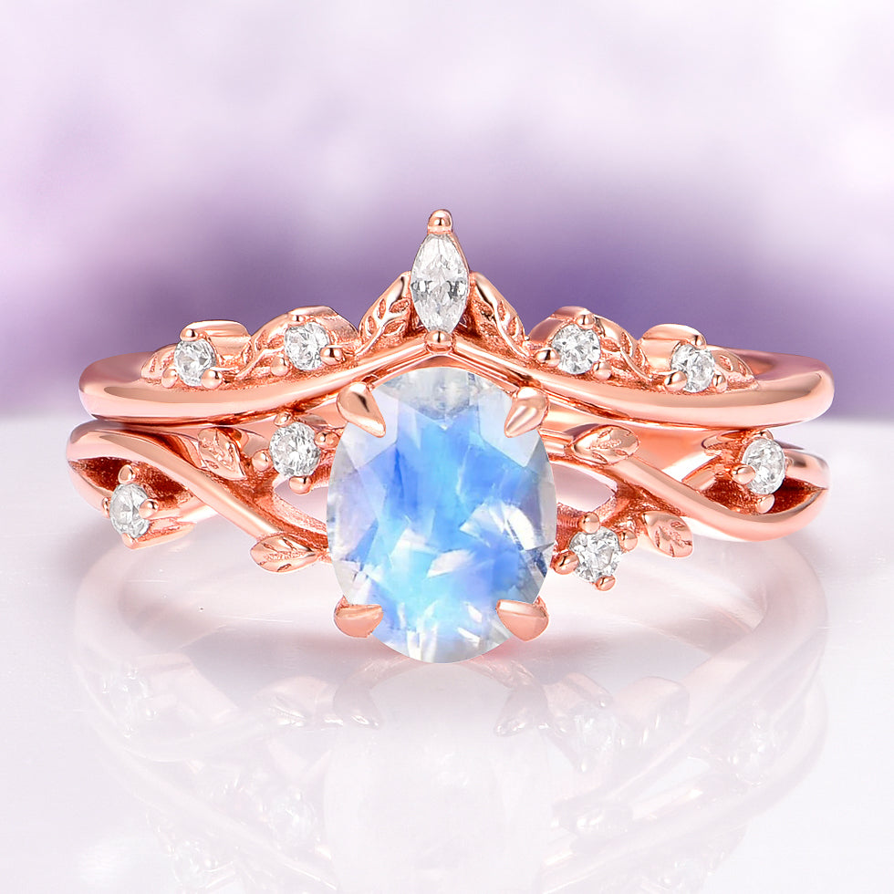 Capture the magic of nature and the enchantment of moonlight with this Rainbow Moonstone Leaf Bridal Ring Set in 14K Rose Gold Vermeil. Designed for brides who dream of a non-traditional, ethereal ring, this set blends natural inspiration with timeless elegance.
