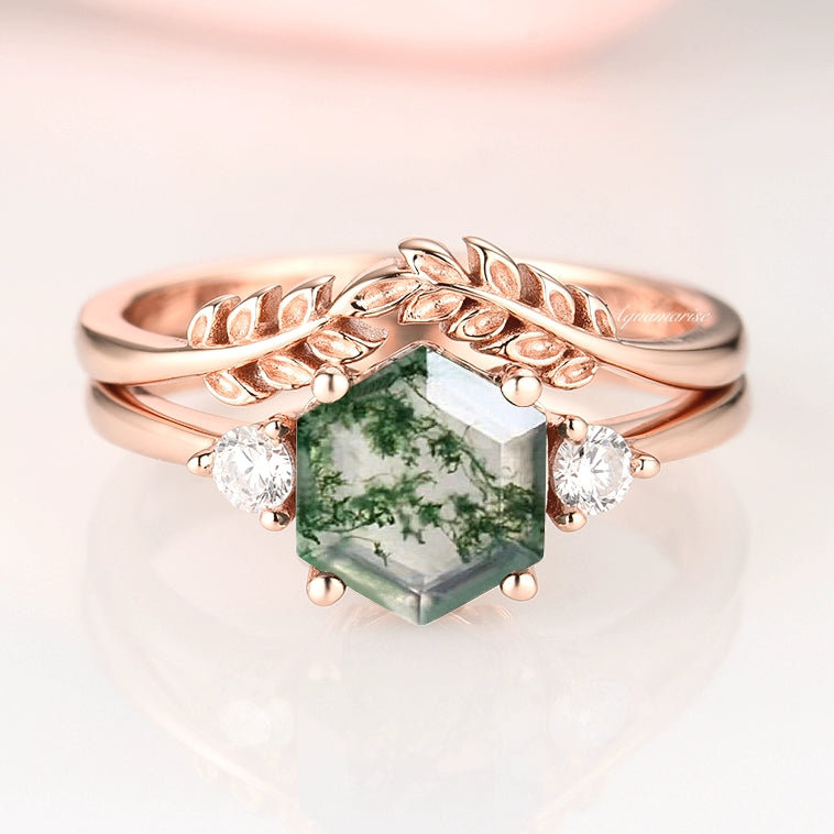 Natural Hexagon Moss Agate Engagement Ring Set- 14K Rose Gold Vermeil