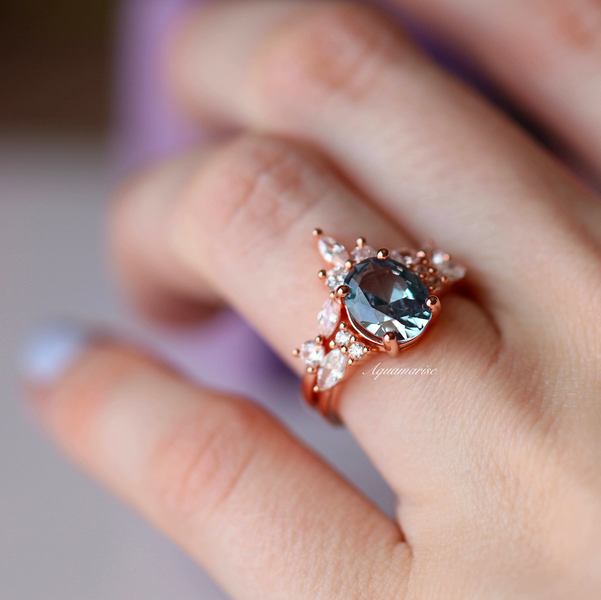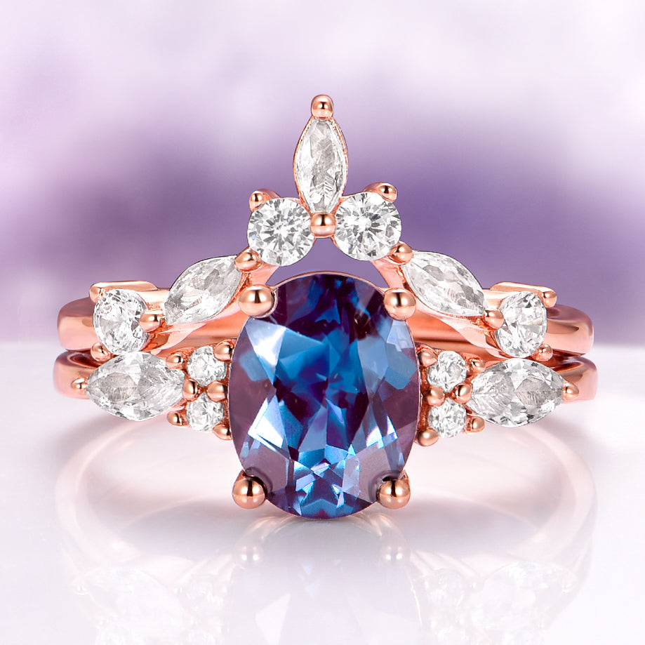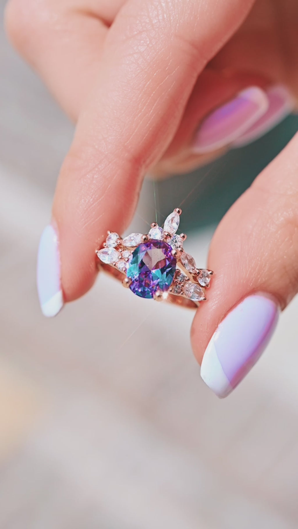 Make an unforgettable statement with this vintage inspired Alexandrite ring set, crafted in 14K rose gold over solid 925 sterling silver. Its timeless elegance and enchanting color-changing gemstone make it a perfect choice as an engagement ring, promise ring, birthstone ring, or statement piece.