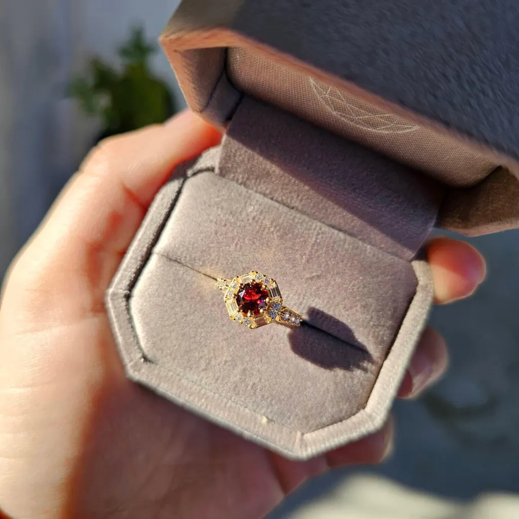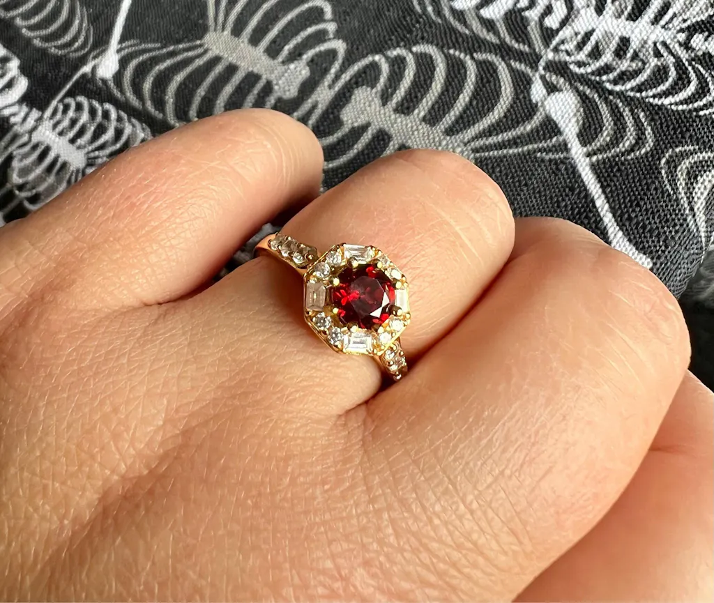 Absolutely gorgeous - my picture can’t do it justice. The garnet is a beautiful deep crimson and the cz are bright white and really compliment the center gem and the yellow gold. Super quick shipping. Would definitely buy again.