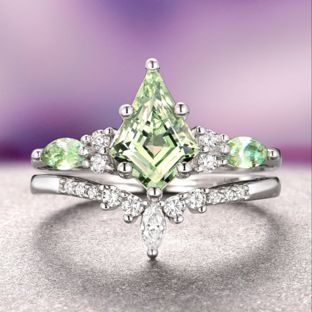 Celebrate your love with the Skye Kite™ Earthy Green Sapphire Ring Set, a modern heirloom that combines bold design with timeless meaning. Crafted in 14K solid white gold, this elegant two-piece set features a striking kite-cut green sapphire, known for its rich hue and symbolism of renewal, balance, and inner strength. Sparkling moissanite or natural diamond accent stones enhance the sleek silhouette, making it a perfect choice for an engagement, anniversary, or meaningful gift.