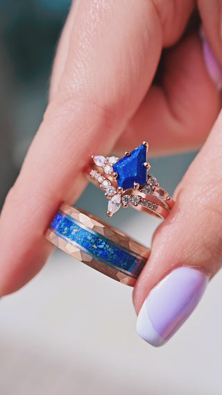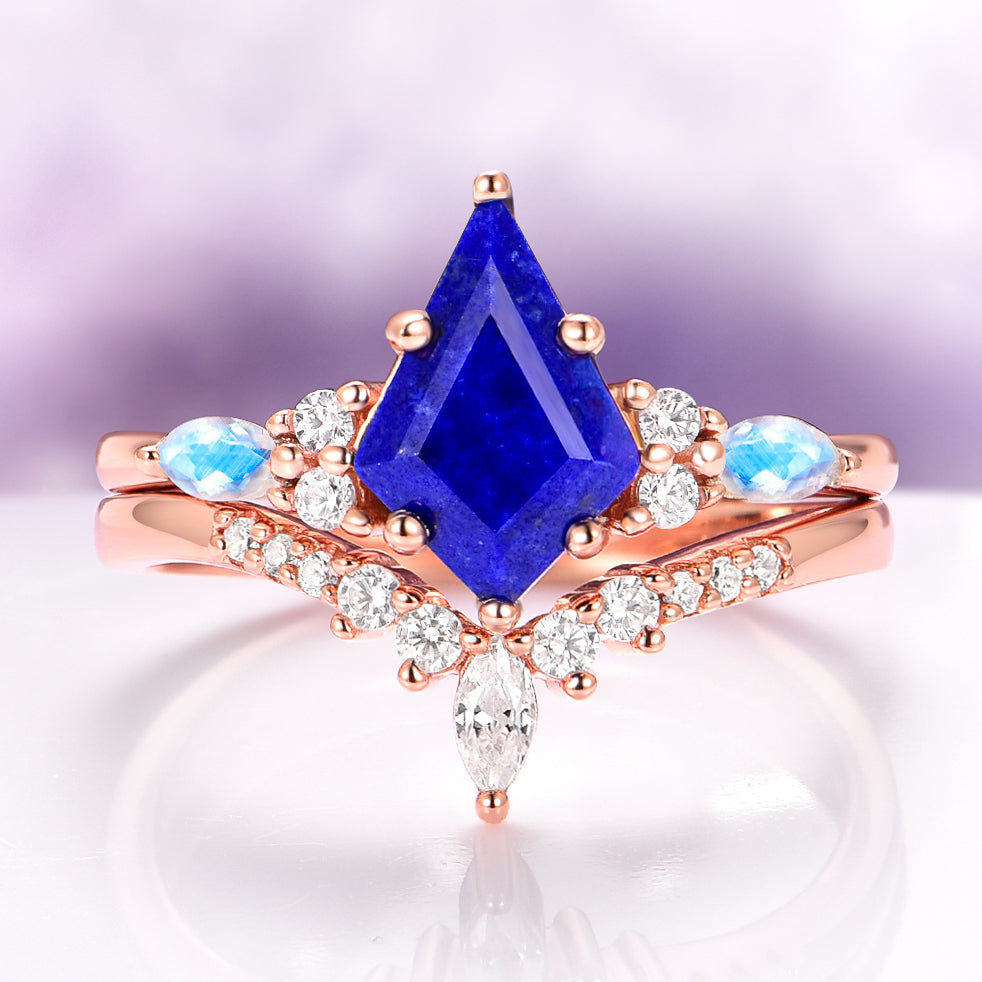 The Skye Kite™ Lapis Lazuli & Moonstone Ring Set is crafted in 14K solid rose gold and features a captivating kite-cut lapis lazuli, a symbol of wisdom and truth. Accented by luminous moonstone side stones and your choice of moissanite or natural diamonds, this celestial-inspired ring set radiates elegance and mystique. Perfect as matching bond rings, promise rings, or a meaningful anniversary gift, the Skye Kite™ Lapis Lazuli & Moonstone Ring Set is a timeless expression of love and individuality. Shop now to customize your perfect ring set!