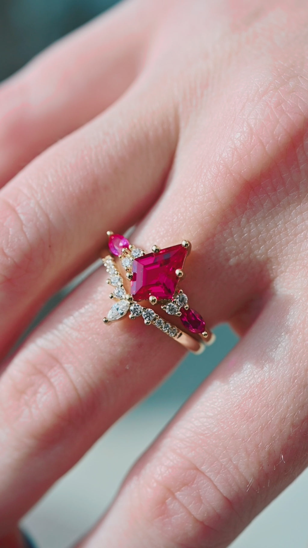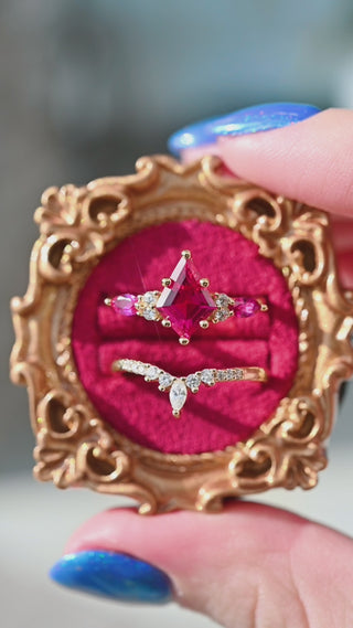 Celebrate your love story with the Skye Kite™ Kite-Cut Ruby Engagement Ring Set, crafted in luxurious 14K solid yellow gold. This stunning ring set features a vibrant, kite-cut ruby, radiating timeless elegance and passion. The unique design is complemented by intricate detailing, making it the perfect choice for those seeking a bold, romantic, and sophisticated engagement ring.