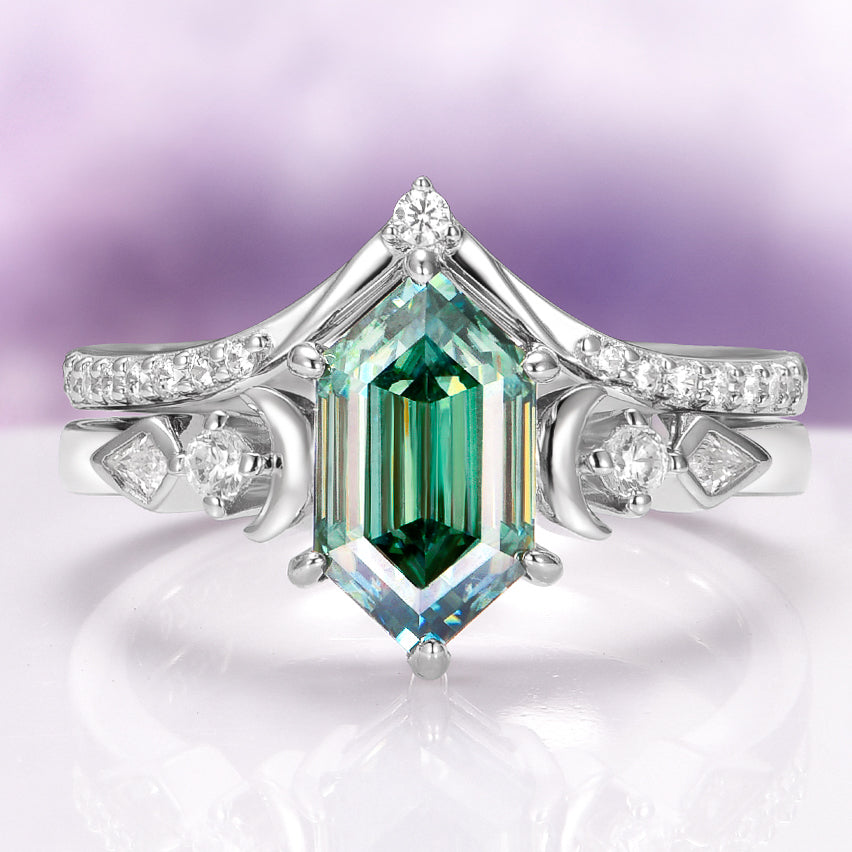 This enchanting Green Moissanite Crescent Moon Engagement Ring Set blends celestial beauty with modern elegance, making it the perfect choice for those who want a unique alternative to a traditional diamond ring. Designed for the dreamer at heart, its hexagon-cut teal moissanite captures the light with mesmerizing flashes of green and blue, while the crescent moon accents add a touch of magic and meaning.