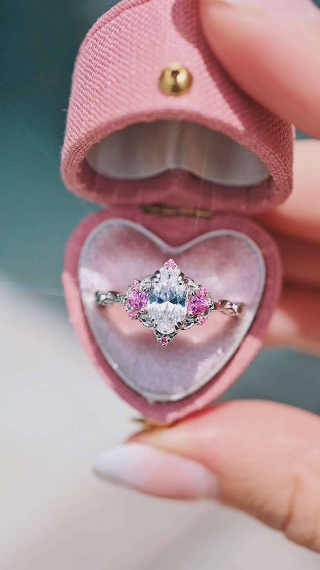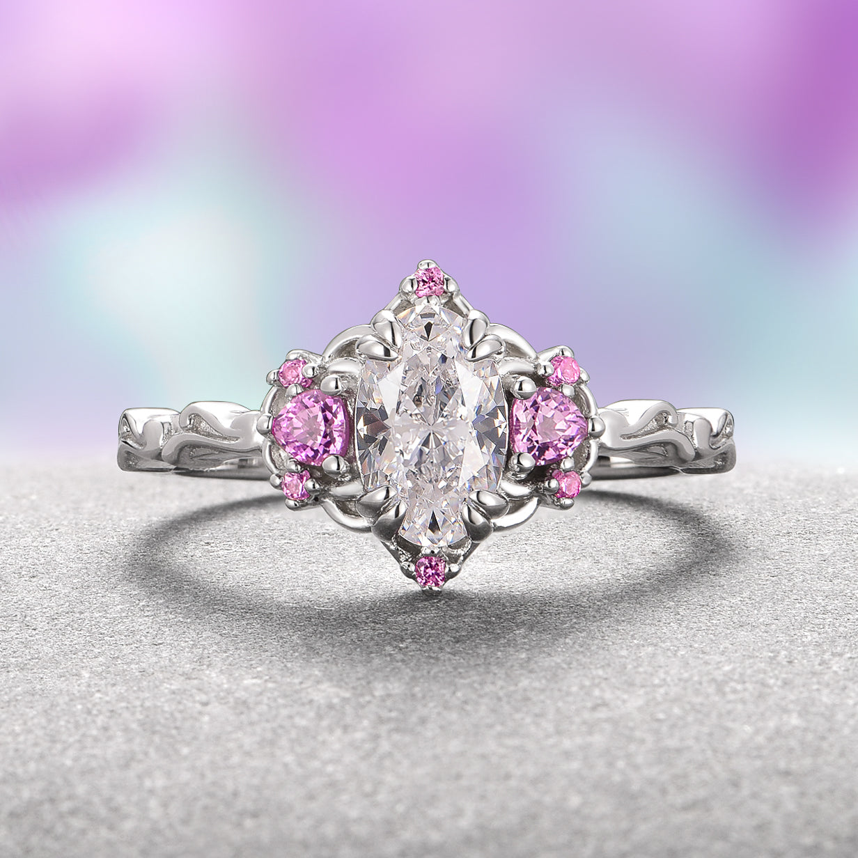 ►Moissanite is celebrated for its extraordinary brilliance and fire, symbolizing everlasting love and clarity. The vibrant pink sapphires add a touch of whimsy and are cherished for their symbolism of passion, joy, and strength. Together, these stones create a harmonious and eye-catching design that’s ideal for lovers of fantasy-inspired jewelry, fairycore engagement rings, and distinctive gemstone jewelry. Whether chosen as a unique engagement ring, promise ring, or special occasion gift, the Esme Ring brings ethereal beauty and bold color to any love story.