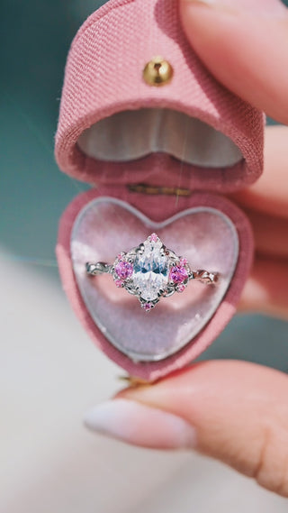 Delicate and captivating, the Esme Ring in 14K Solid White Gold features a brilliant moissanite center stone, framed by sparkling pink sapphire accents. This non-traditional engagement ring seamlessly blends timeless elegance with a playful, romantic twist, making it a perfect choice for those who seek something truly unique.