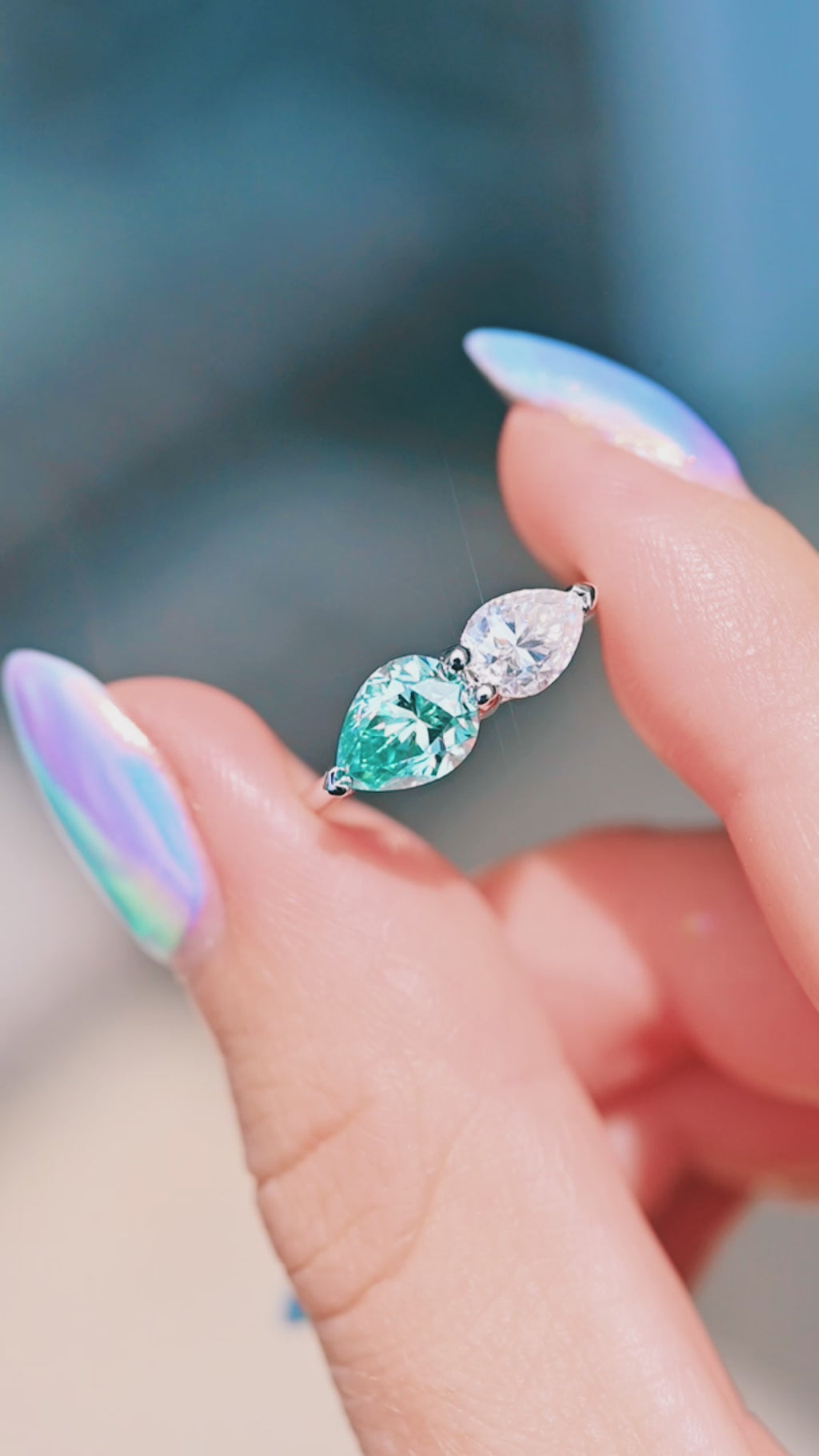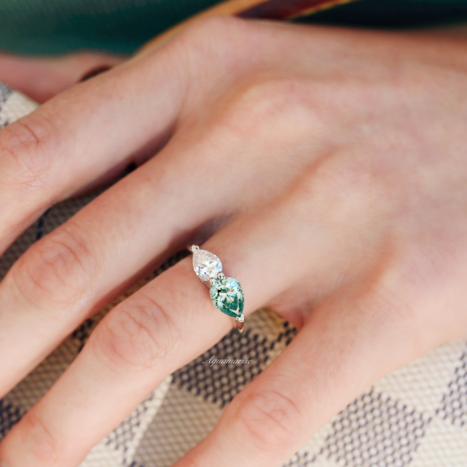 This ring is stunning. I can’t believe how much it sparkles! The colour of the blue moissanite shifts from blue to teal to green depending on the light. It’s gorgeous! I love how the ring is eye-catching while sitting low profile on my finger. The seller was quick to answer my question and even quicker to ship the ring! Shipped the day after I ordered it and it arrived in Canada a week later. This ring is incredibly beautiful and unique. Don’t hesitate to purchase. You won’t be disappointed!