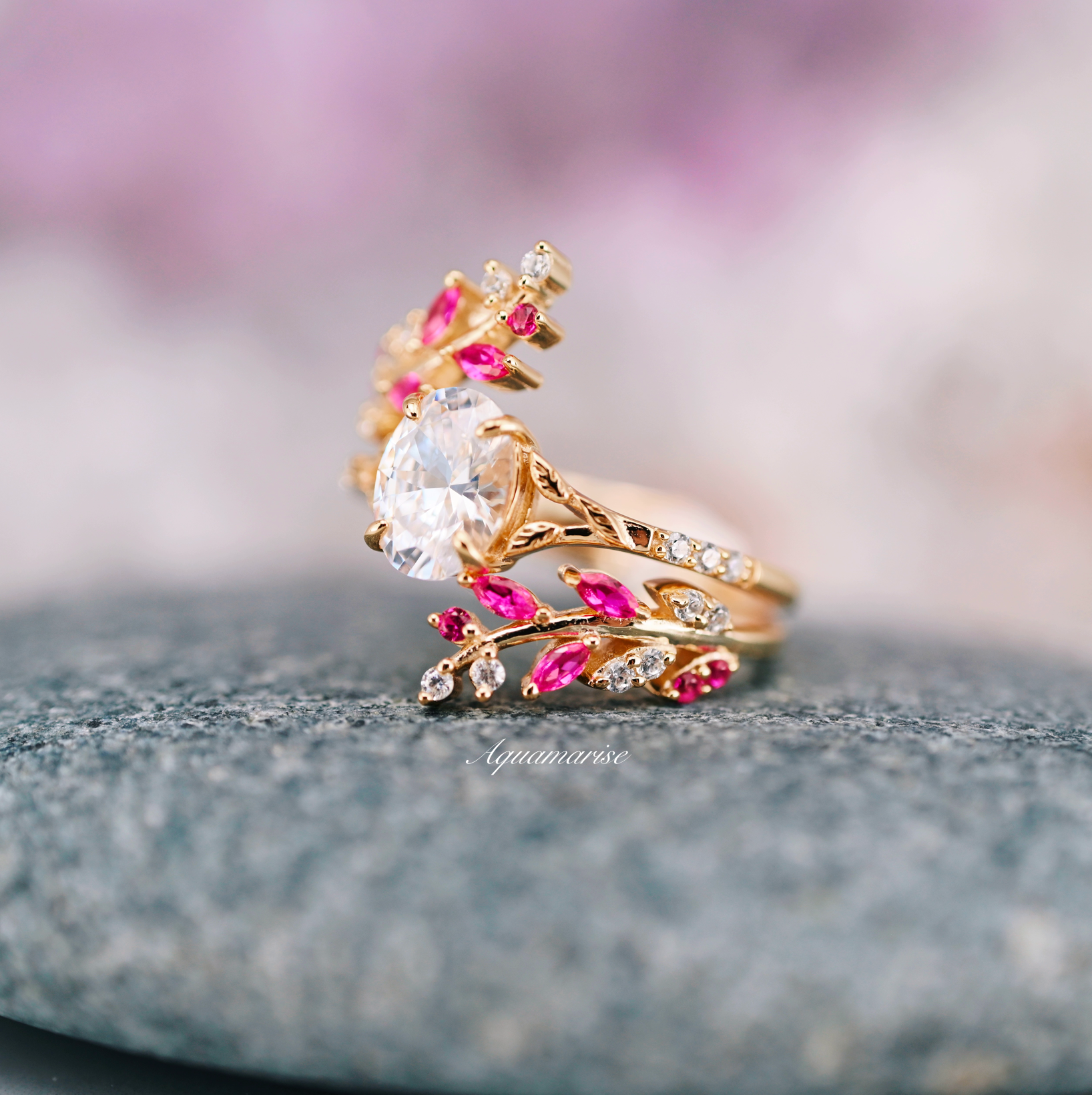 Embrace the fairy tale with the Red Ruby & Moissanite Leaf Engagement Ring Set, where every glance at your hand brings a reminder of love's enduring magic.