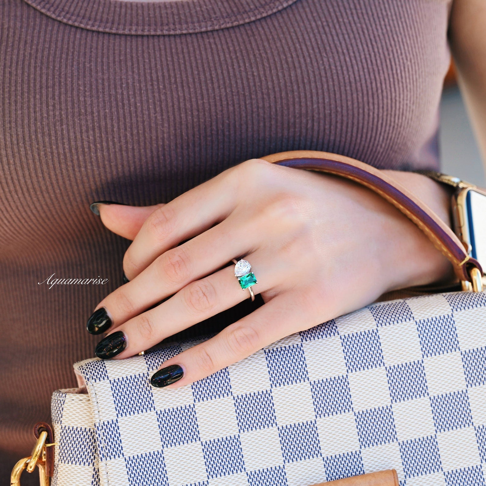 Toi Et Moi Emerald and Moissanite Ring- 14K White Gold