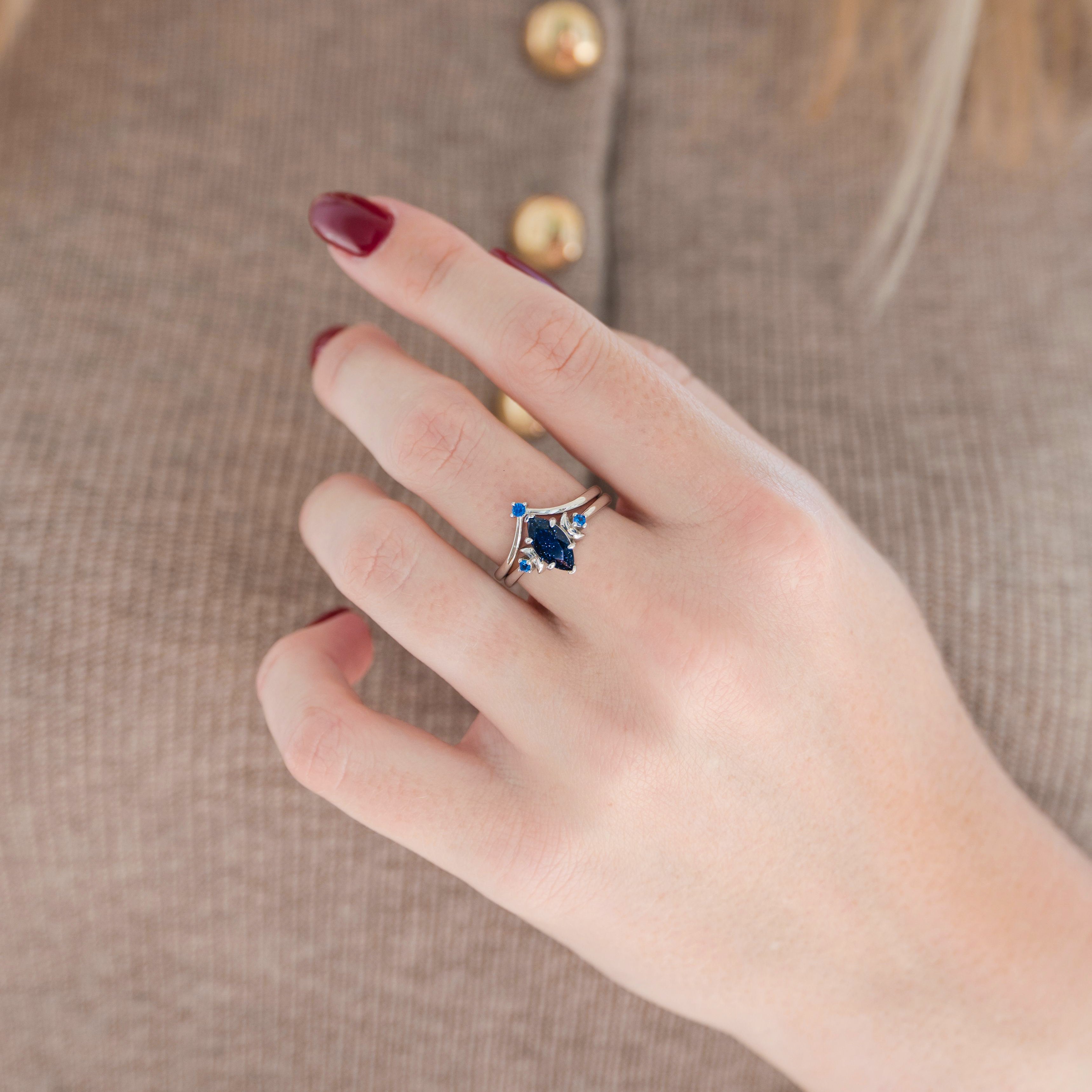 Embrace the beauty of the cosmos with the Starry Night & Blue Sandstone Engagement Ring Set. Crafted from 14k white gold, this captivating ring set showcases a mesmerizing blue sandstone at its center, evoking the enchanting allure of a starlit sky. Accentuated by sparkling sapphire stones and intricate moon and star details along the band, this celestial design symbolizes serenity, wisdom, and the magic of the universe.