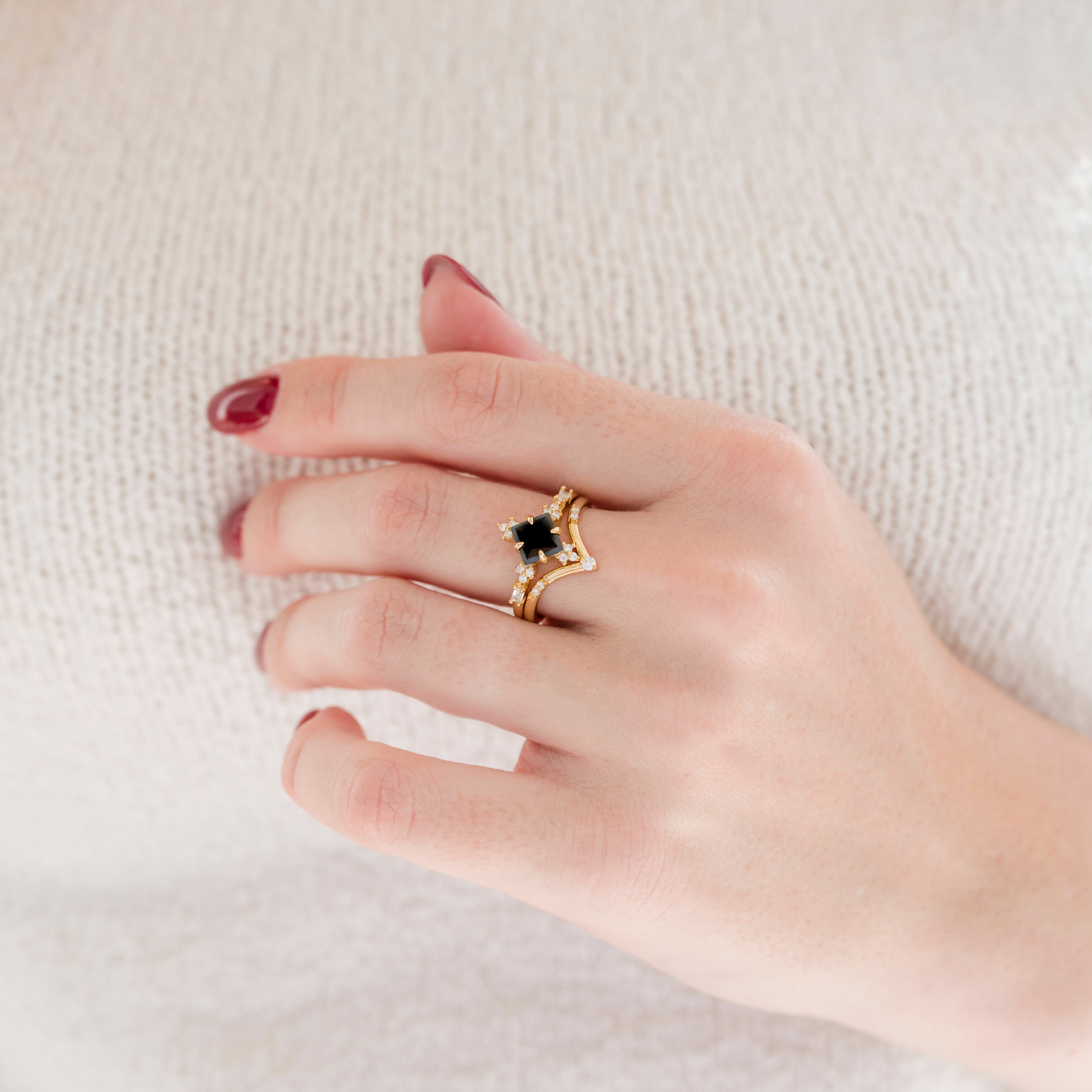 The sleek, geometric lines of the princess-cut onyx are accentuated by the clean, polished gold band, offering a modern yet classic look. This ring set is perfect for those who desire something unique and unconventional, a true reflection of personal style and sophistication.