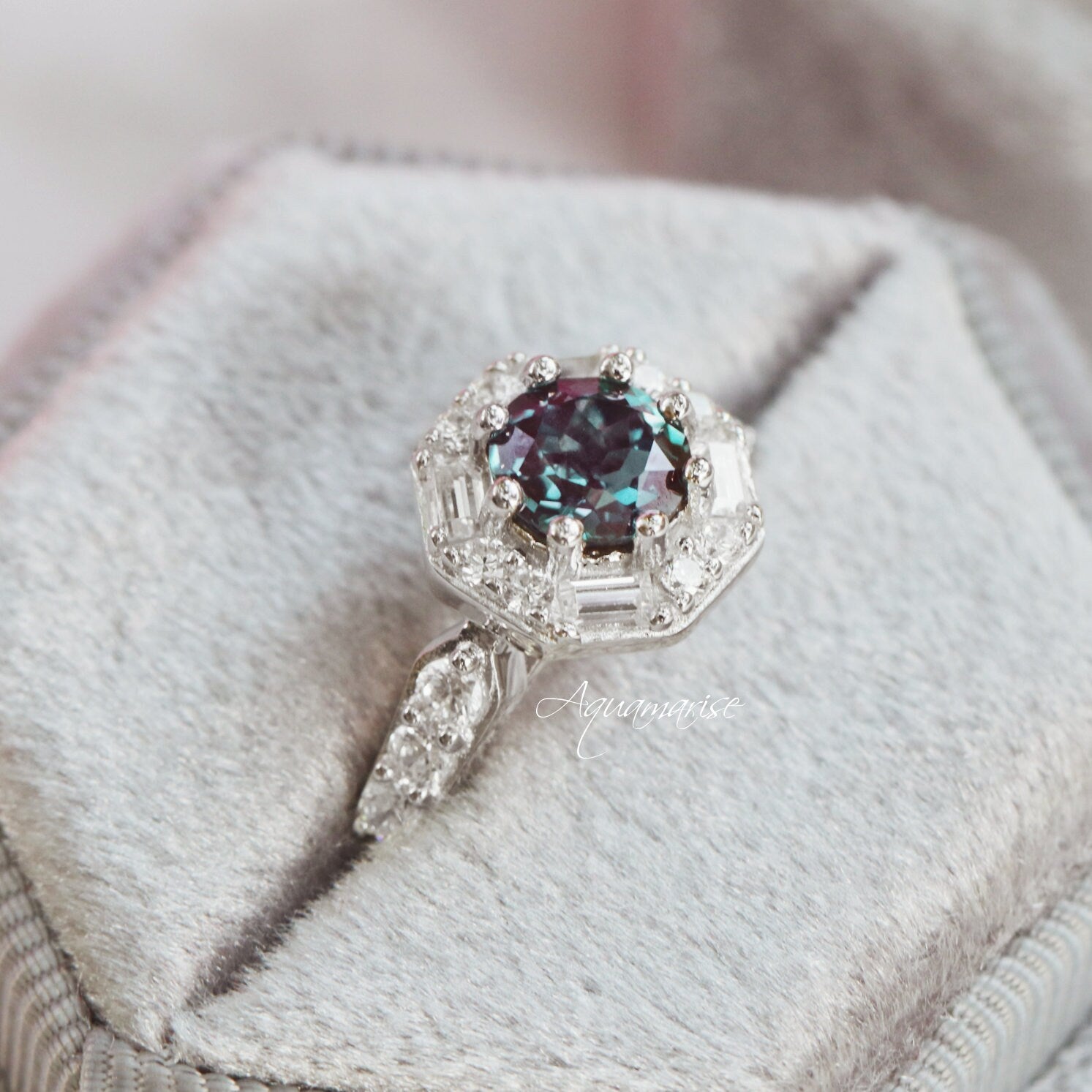 You cannot capture the essence of this beautiful ring in a photo. It sometimes looks blue, sometimes purple, sometimes greenish-blue. It has depth, so the color changes with the light. Beautifully crafted and simply stunning. I love it!