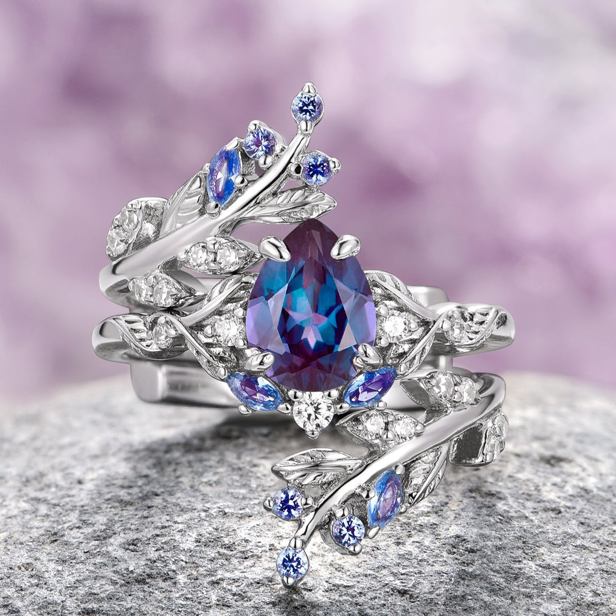 Celebrate your love story with the Teardrop Alexandrite Leaf Engagement Ring Set, a whimsical and enchanting design perfect for engagements, promises, or special anniversaries. This sterling silver 2-piece ring set is inspired by nature, featuring intricate leaf detailing and a mesmerizing teardrop-shaped alexandrite, making it an unforgettable gift for her.