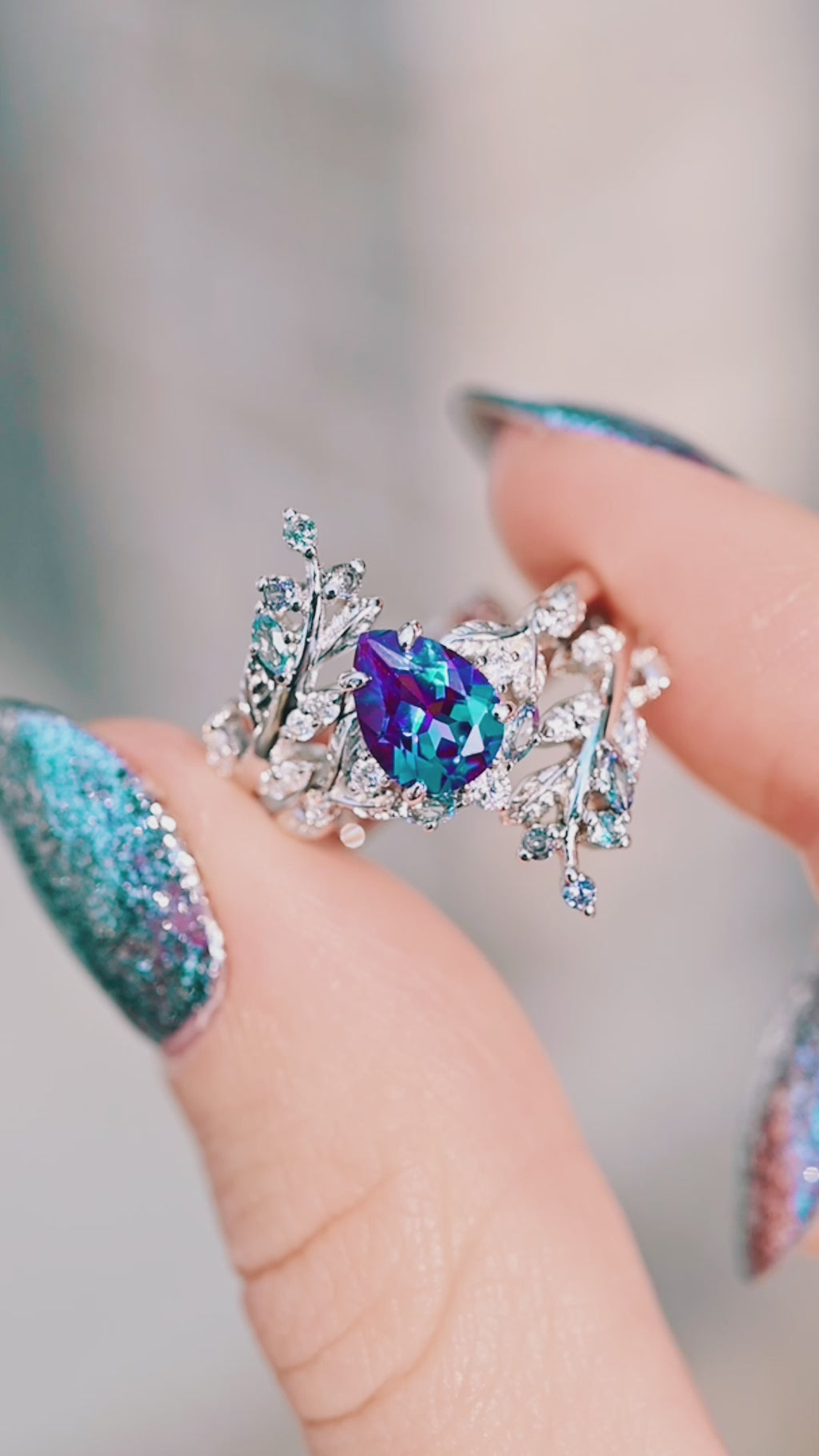 ►Center Stone: A teardrop-shaped lab-grown alexandrite, symbolizing love and transformation. Alexandrite is the birthstone for June, adding a personal and meaningful touch.