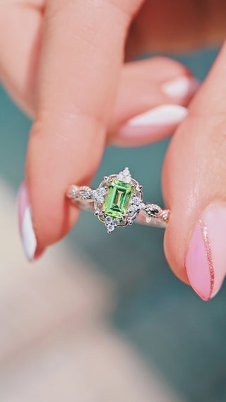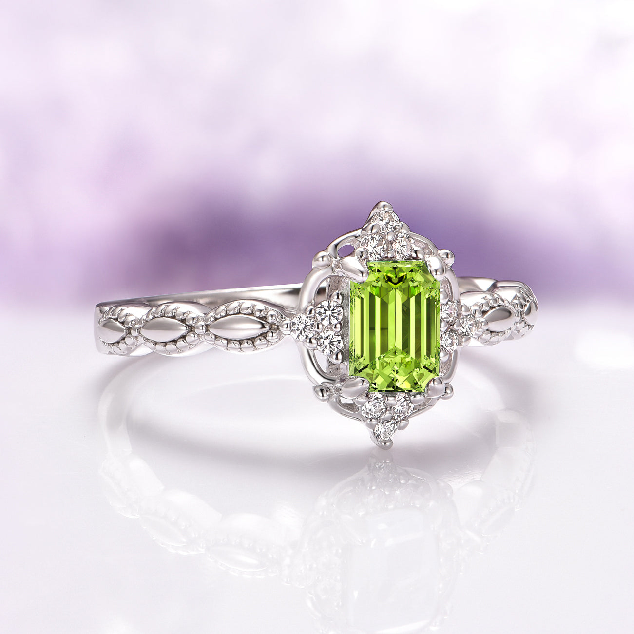 Celebrate timeless elegance with this vintage-inspired natural peridot ring, perfect as an engagement ring, promise ring, or meaningful gift for August birthdays. Handcrafted from solid 925 sterling silver with a rhodium finish, this unique Art Deco design highlights a vibrant emerald-cut natural peridot surrounded by sparkling simulated diamond accents.
