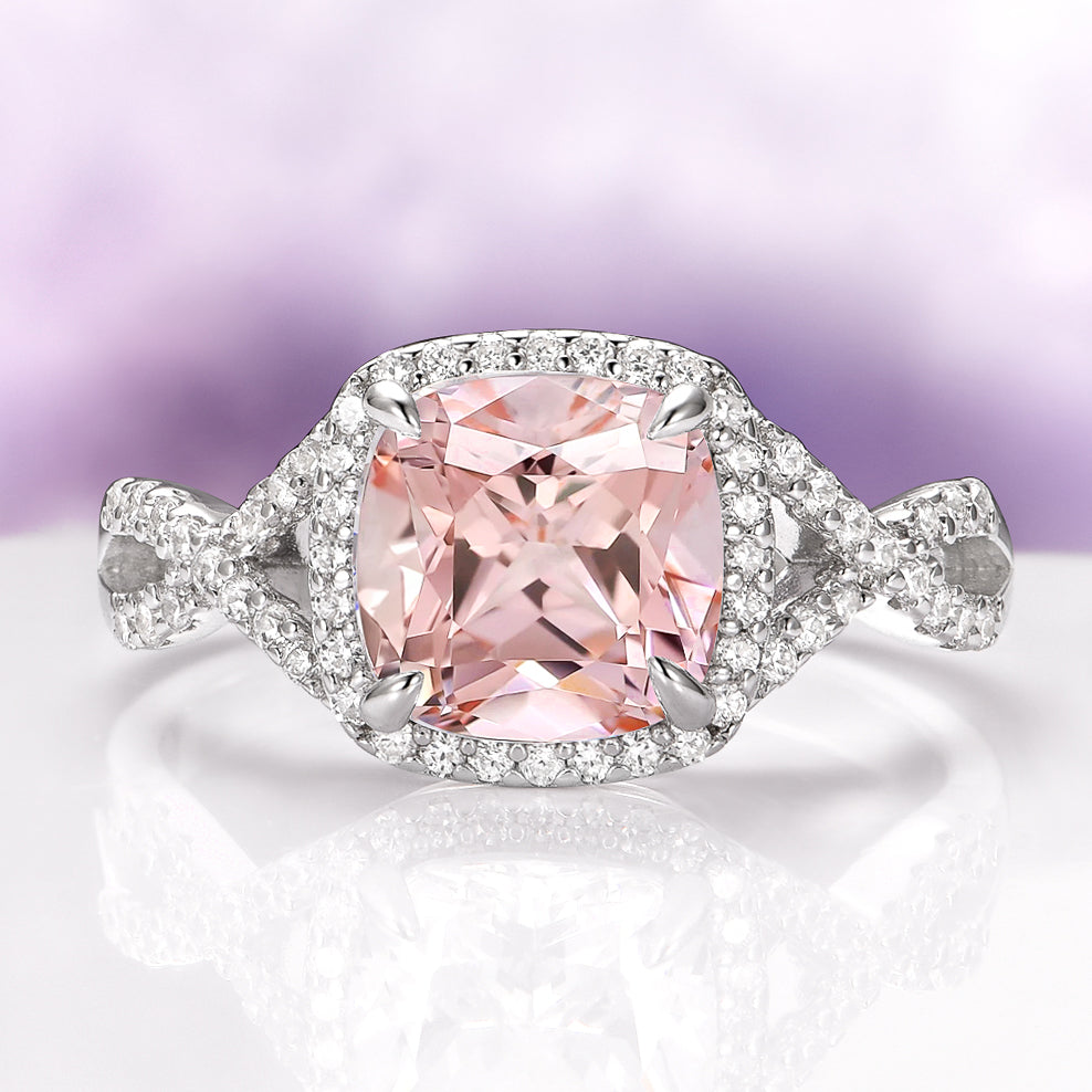 This romantic blush pink ring captures the essence of timeless love and modern elegance. The cushion-cut simulated morganite sparkles with soft feminine hues, beautifully complemented by the infinity twisted vine band crafted in solid sterling silver with a radiant rhodium finish.