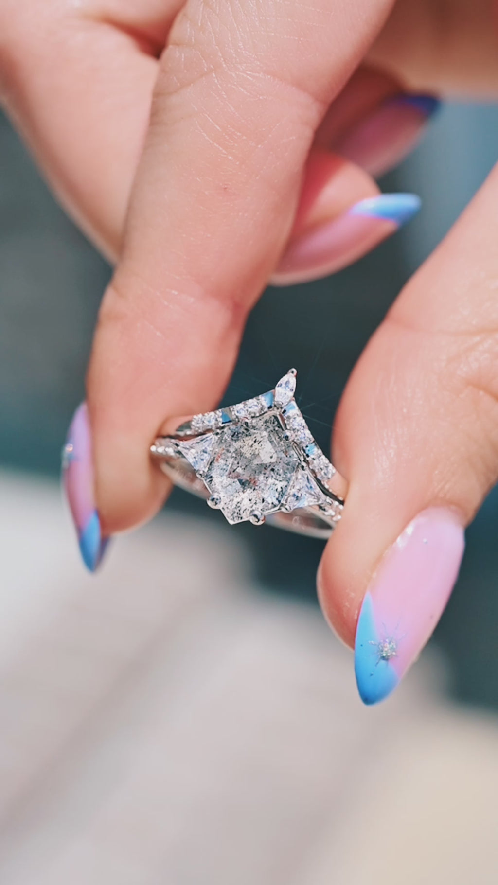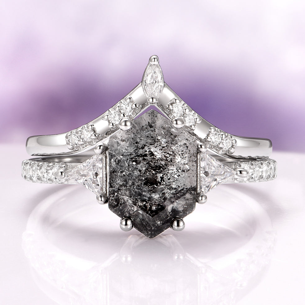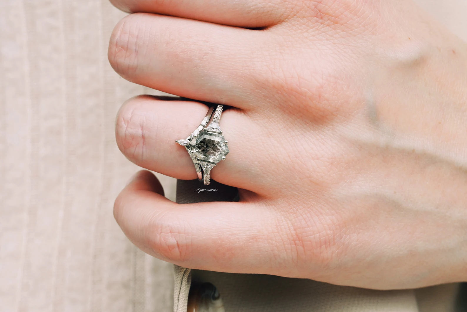 This salt and pepper hexagon Herkimer diamond ring set is a stunning fusion of raw beauty and modern craftsmanship, making it an unforgettable gift for yourself or someone special.