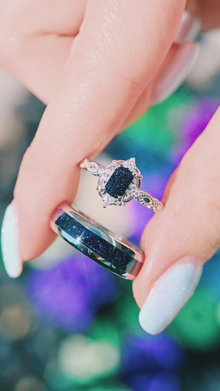 Celebrate your love story with a ring inspired by the cosmos. This celestial engagement ring features a deep navy blue galaxy sandstone center stone that sparkles like a starlit sky, cradled in a classic emerald cut. Perfect for lovers of fantasy, stargazers, and fans of the Night Court aesthetic, this ring makes a stunning statement as an engagement ring, promise ring, or anniversary gift.