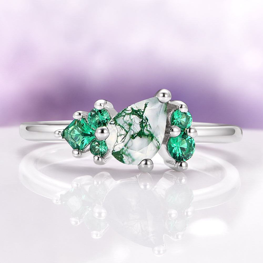 Discover the serene beauty of nature captured in our Green Moss Agate & Emerald Ring, a design that celebrates individuality and craftsmanship. Each natural moss agate gemstone displays intricate, earthy green inclusions that resemble lush moss frozen in time, creating a one-of-a-kind masterpiece in every ring.