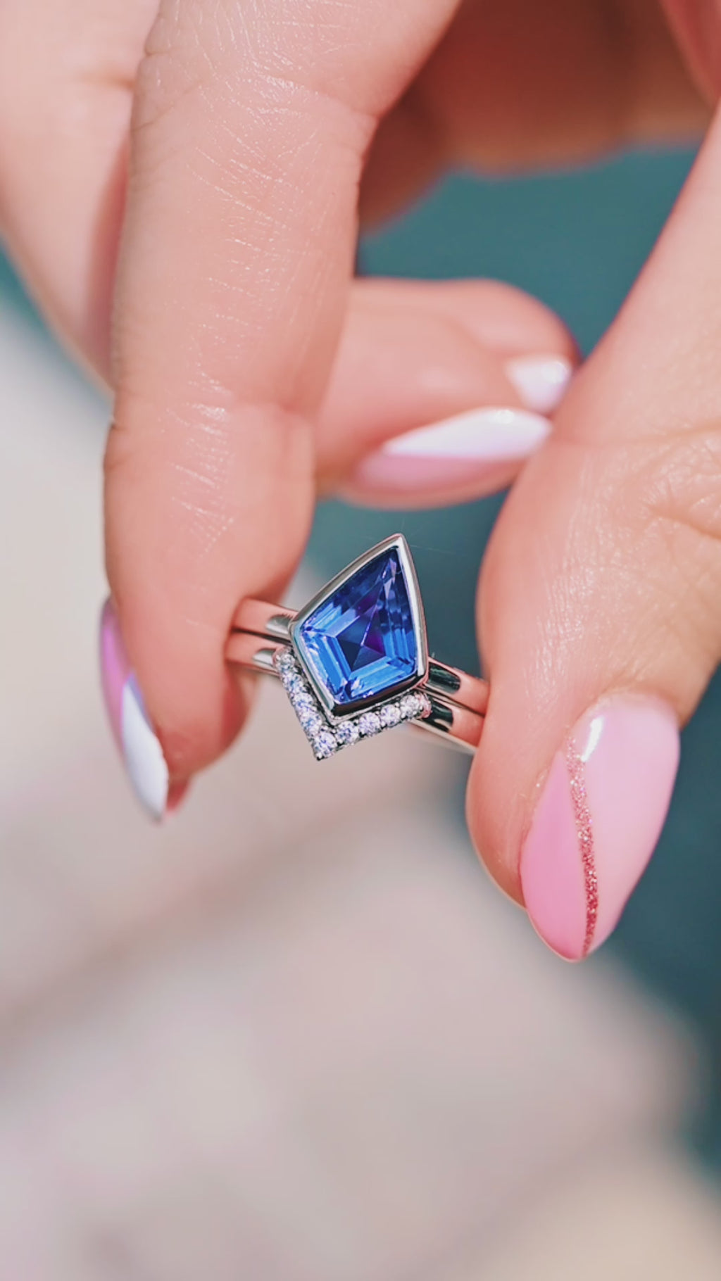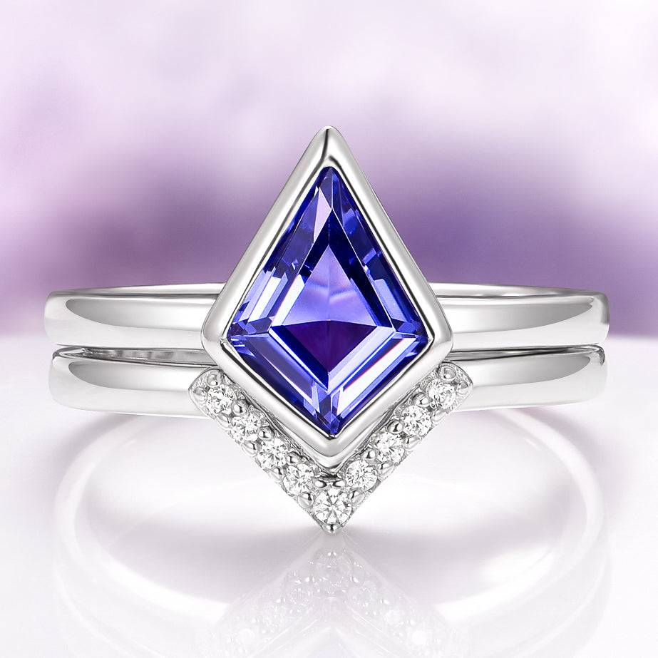Elevate your love story with this stunning Kite Cut Tanzanite Engagement Ring Set, handcrafted in high-quality 925 sterling silver with a rhodium finish for lasting shine and durability. Designed with a clean, minimalist bezel setting, this unique ring set makes the perfect promise ring, engagement ring, or anniversary gift for her.