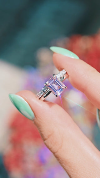 This gorgeous emerald cut morganite engagement ring is crafted from solid 925 sterling silver, offering timeless elegance with a touch of blush pink romance. Featuring a radiant simulated peachy-pink morganite at its center, accented with sparkling simulated diamonds in a hidden halo design, this ring makes a stunning statement as an engagement ring, promise ring, or anniversary gift.
