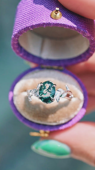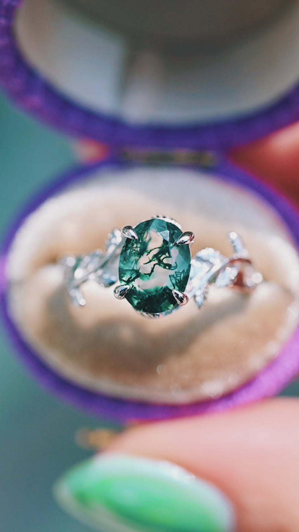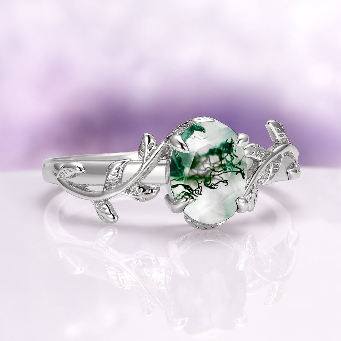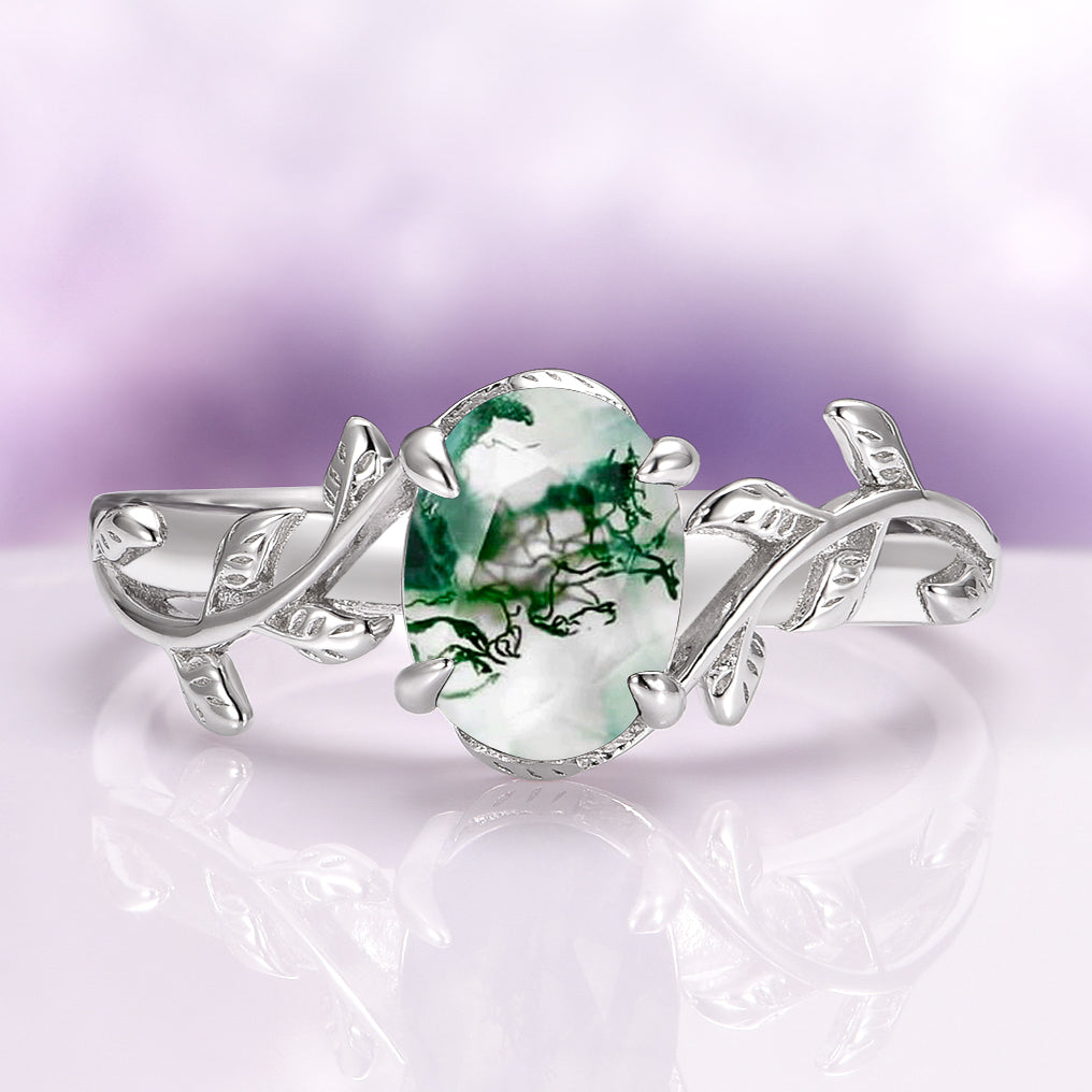 Natural Green Moss Agate Leaf Engagement Ring in Sterling Silver