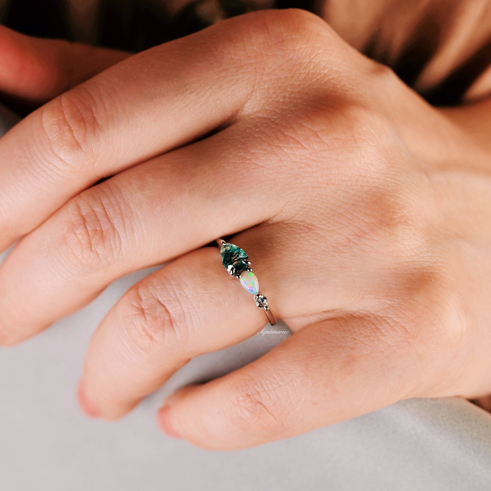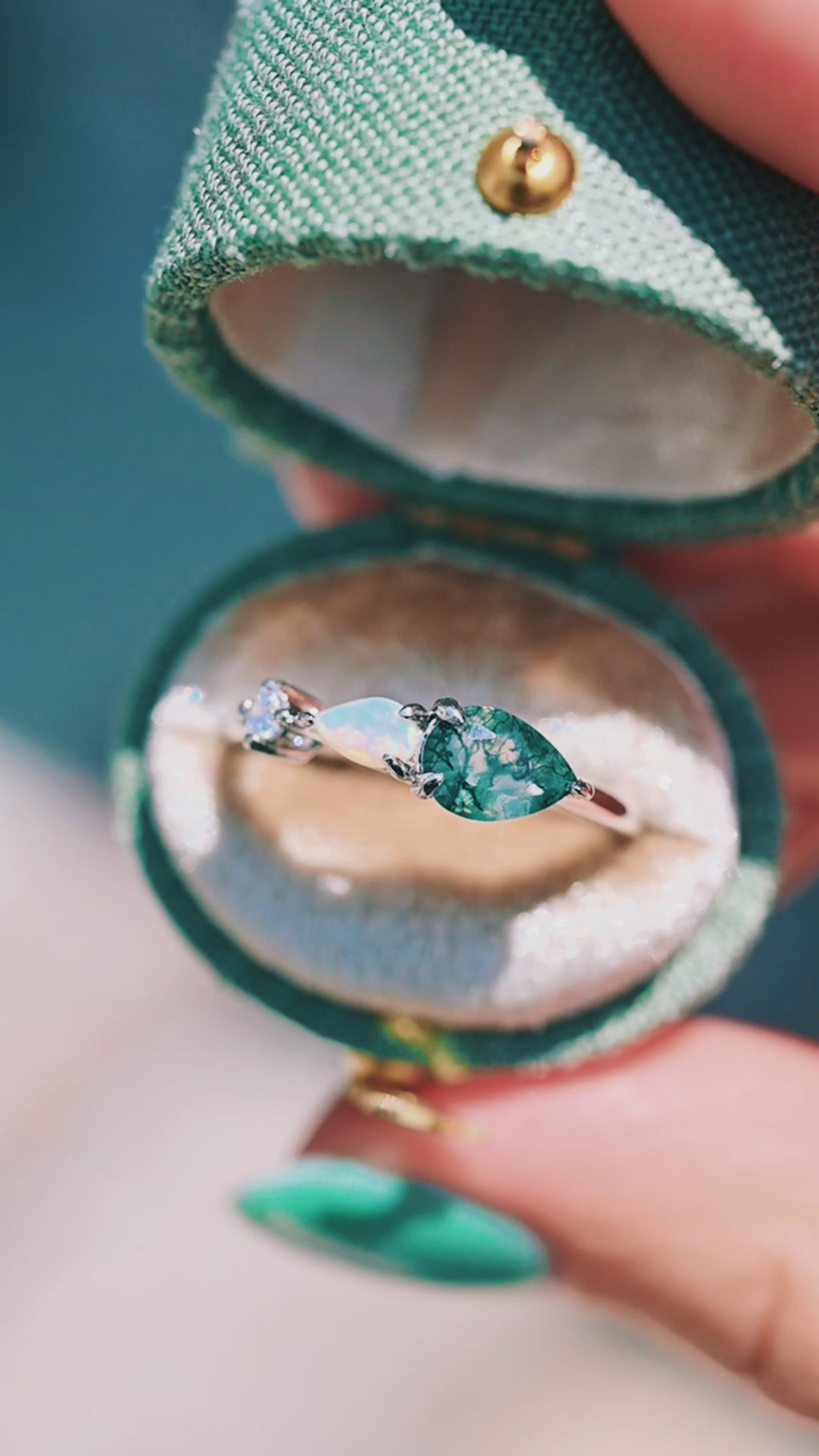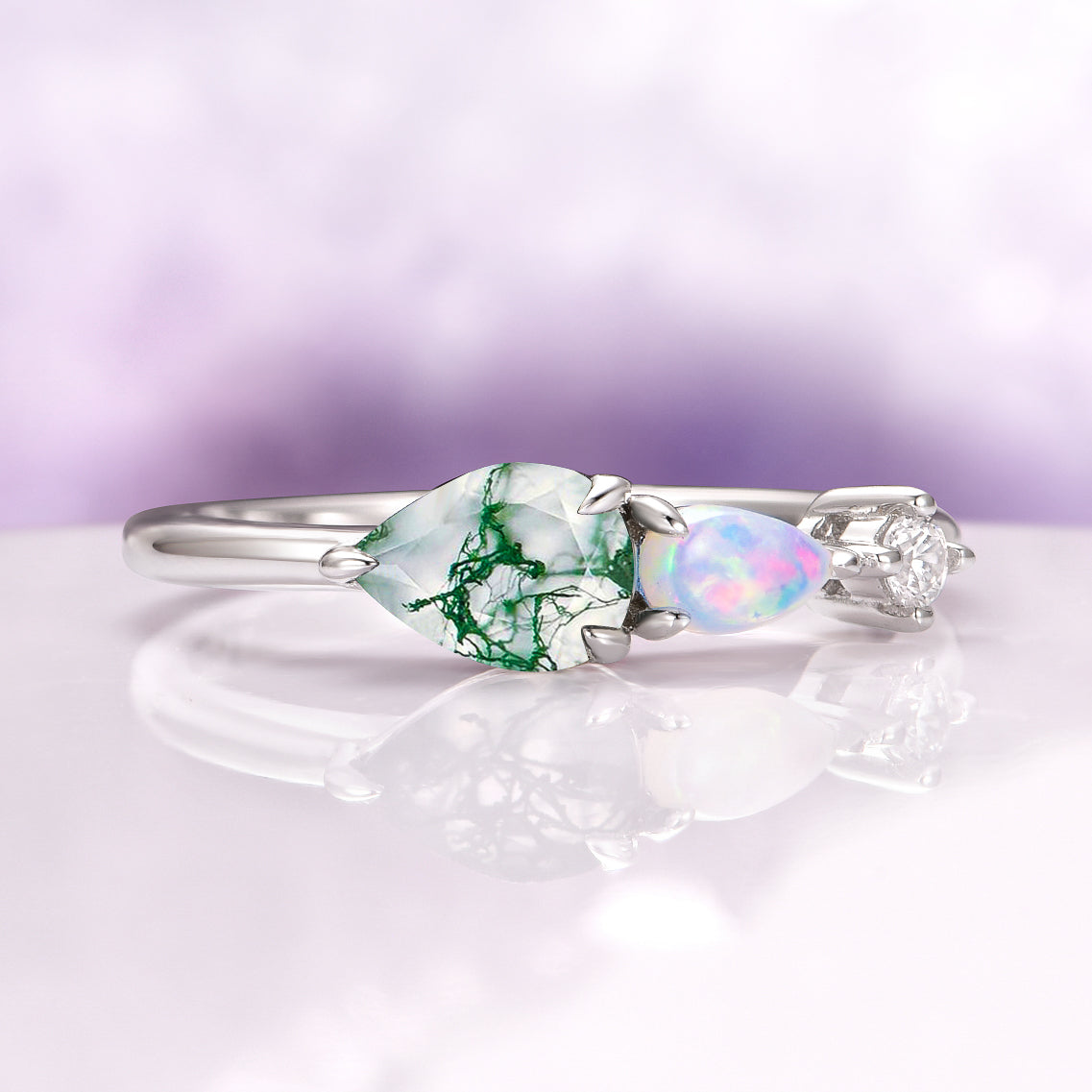 Green Moss Agate & Natural Australian Fire Opal Ring in Sterling Silver