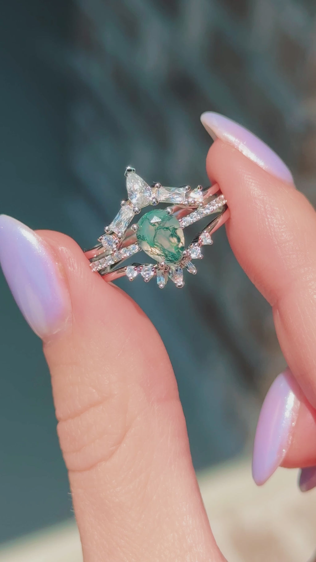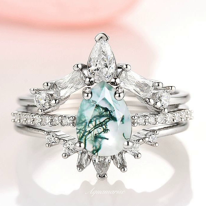 Natural Green Moss Agate 3pcs Ring Set- Sterling Silver