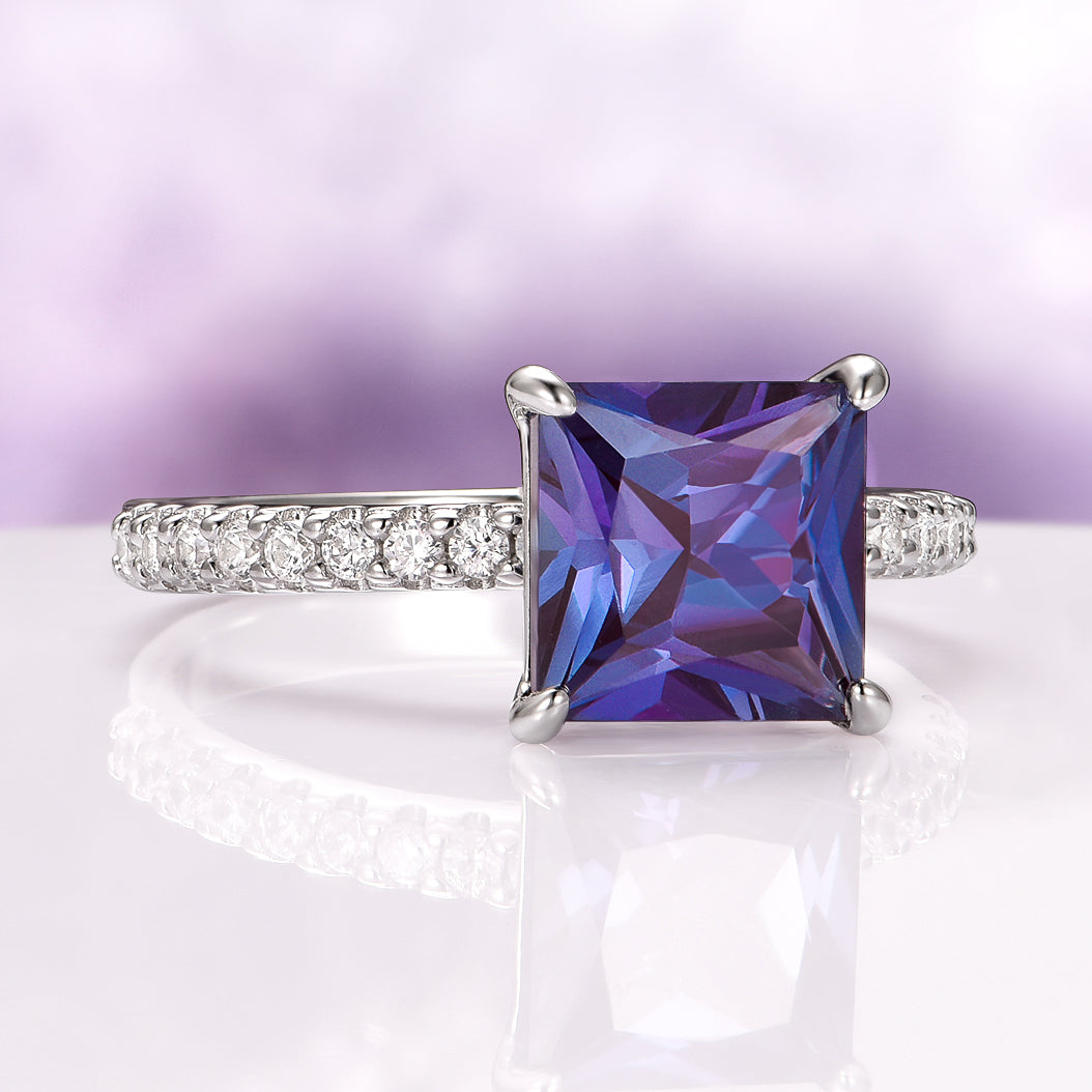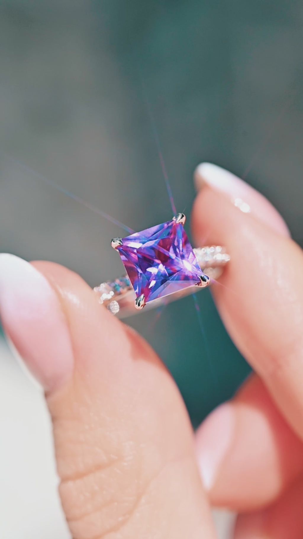 Bold and enchanting, this Princess Cut Alexandrite Ring features a striking 3CT color-changing gemstone that shifts between deep teal and rich violet tones. Set in polished sterling silver, it makes a stunning engagement ring, promise ring, or June birthstone gift for her, perfect for those who love a unique, magical touch in their jewelry.