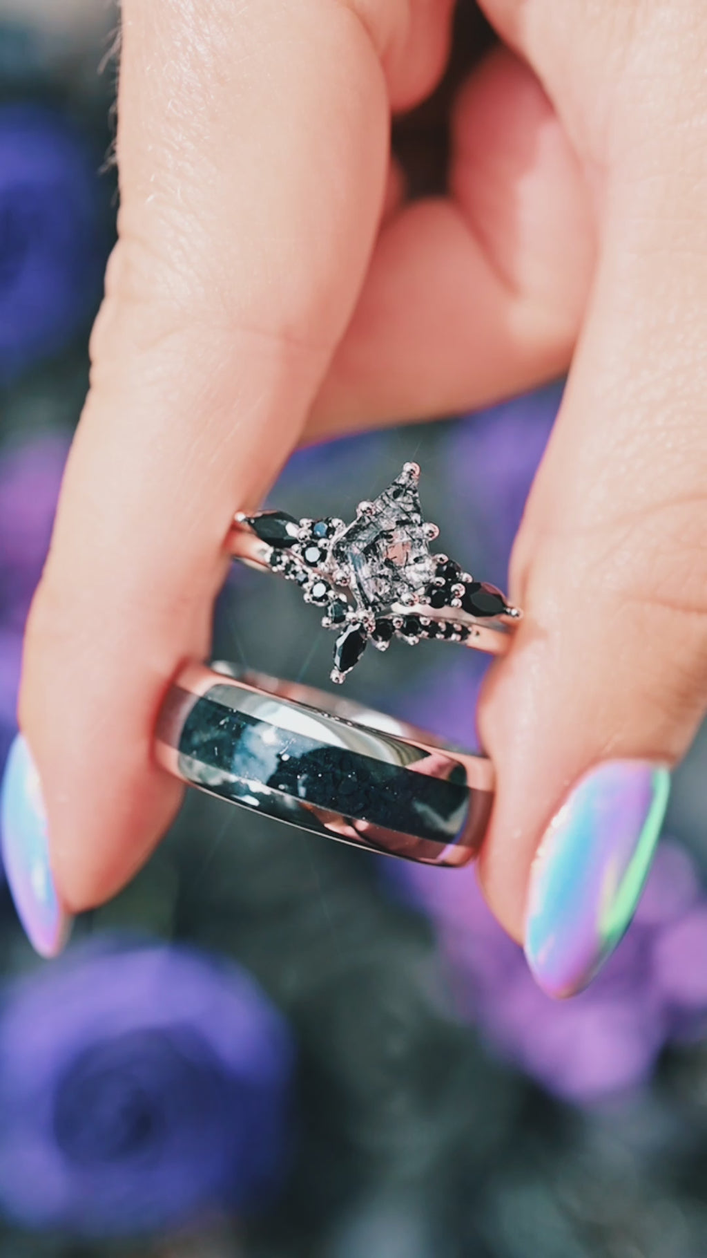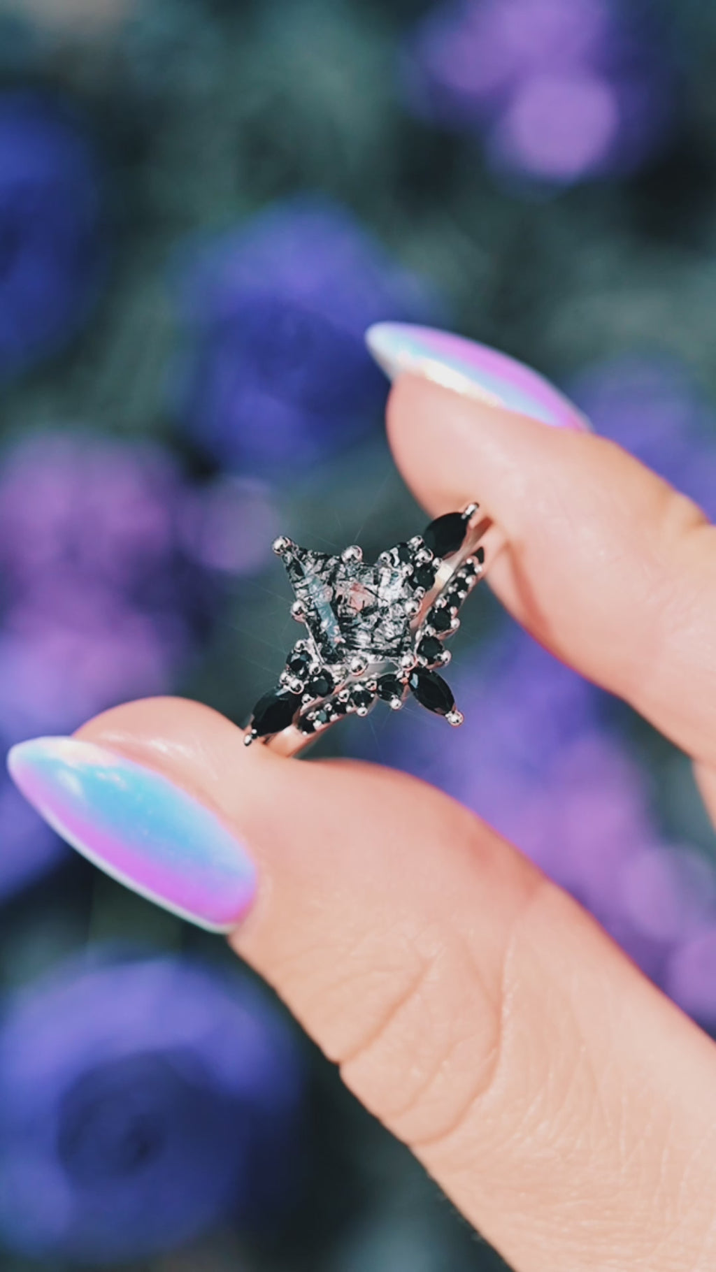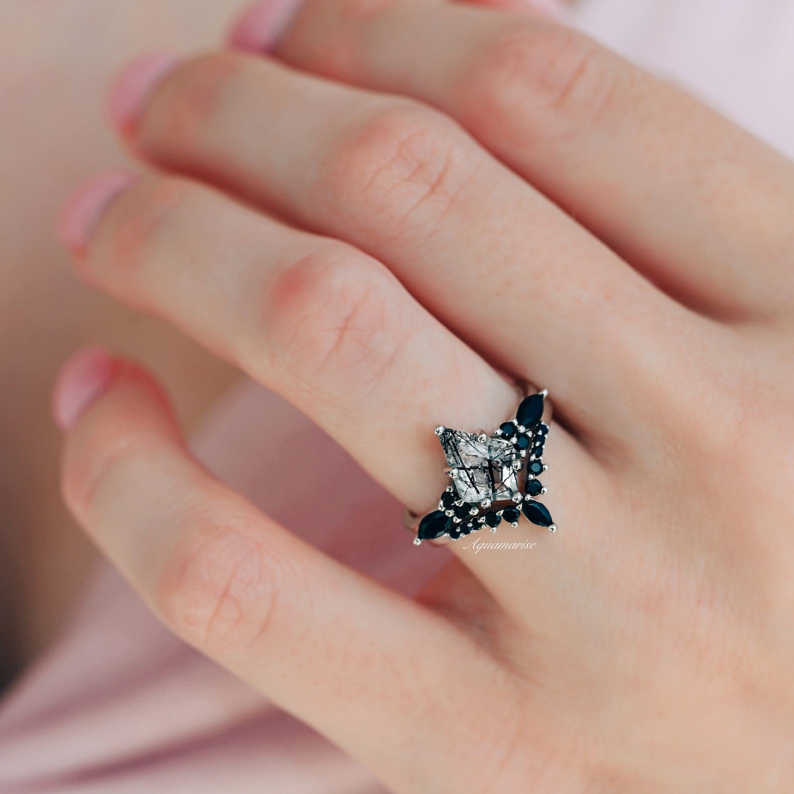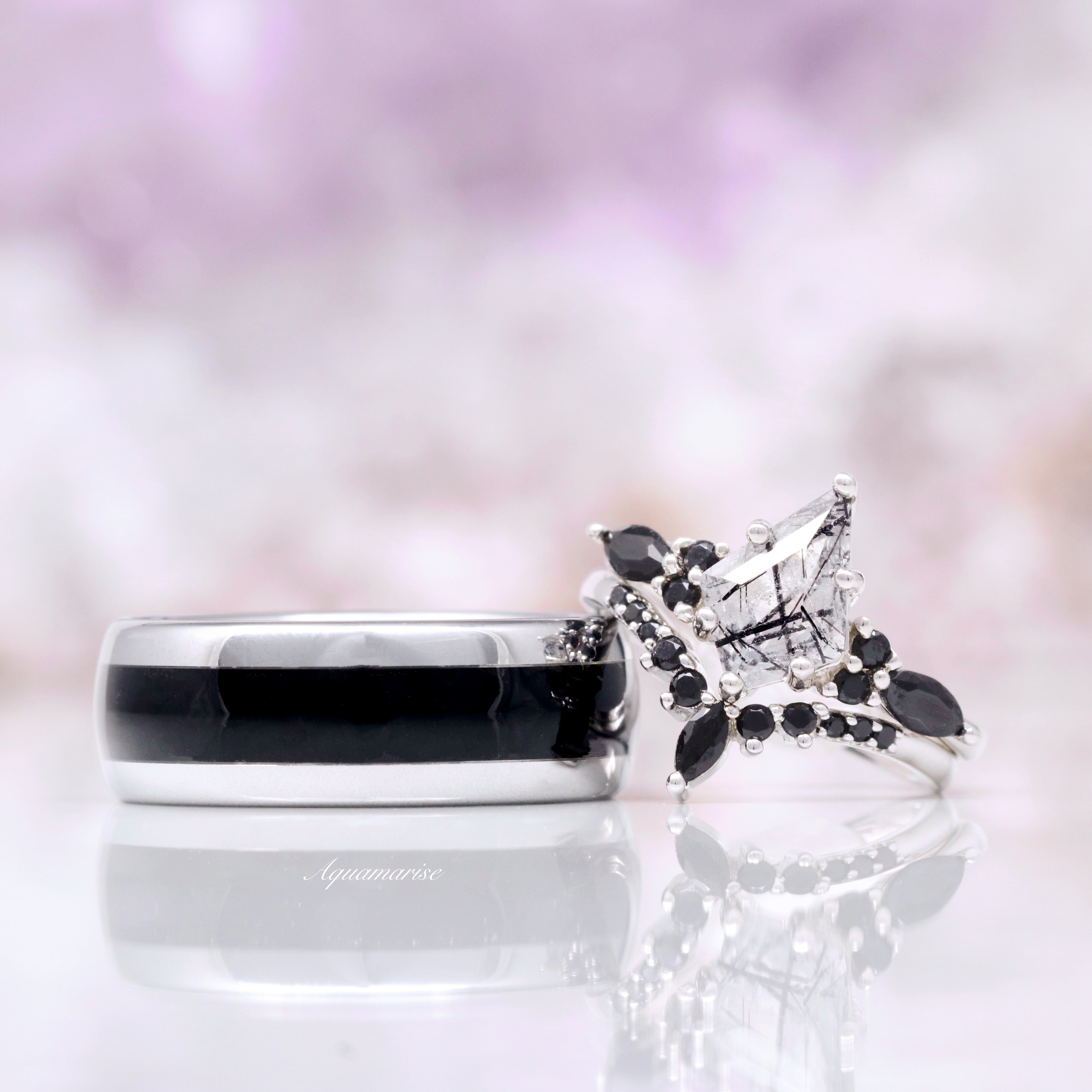 Skye Kite Cut Natural Rutilated Quartz & Black Onyx Skye Ring Set, a stunning embodiment of timeless elegance and shared love. Crafted with meticulous attention to detail, this enchanting ring set is a symbol of connection, harmony, and the unique bond between two individuals.