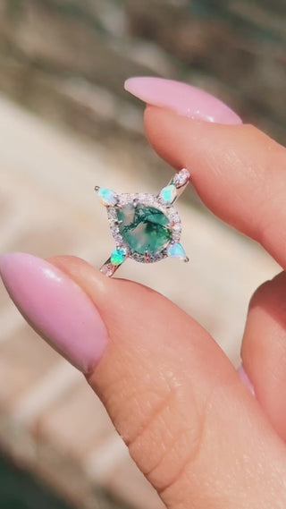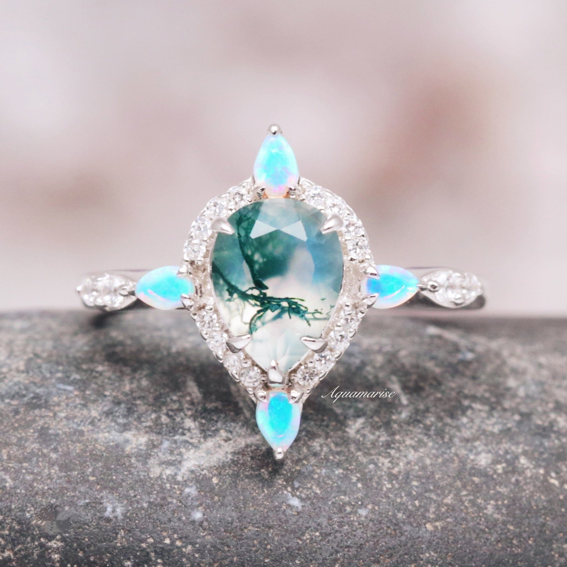 Teardrop Green Moss Agate & Fire Opal Engagement Ring- 925 Sterling Silver