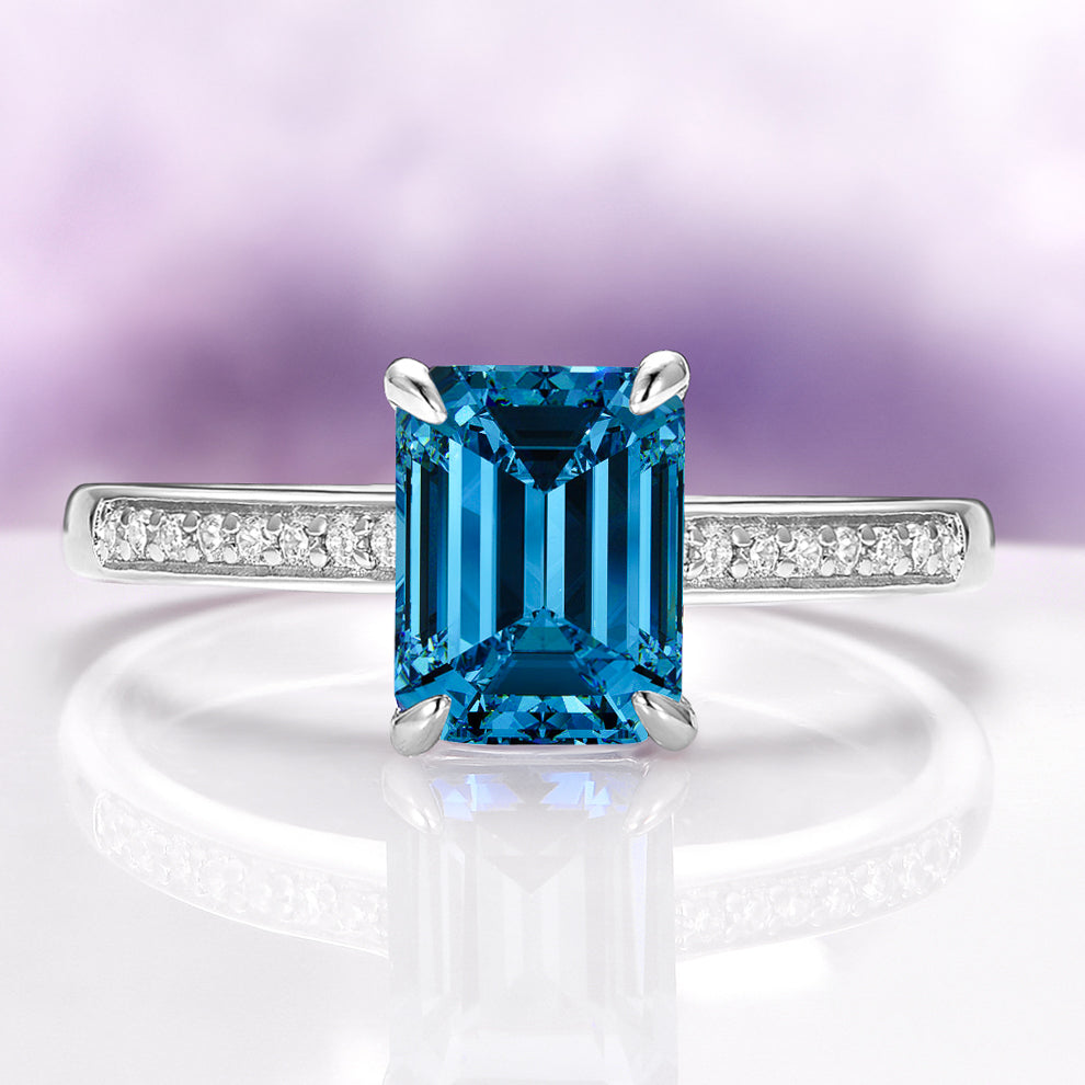 The approximately 1.7 ct center stone is accented by shimmering simulated diamond (cubic zirconia) side stones, adding subtle brilliance without overpowering the bold presence of the emerald cut. A slim 1.7 mm band keeps the profile graceful and modern, allowing the center stone to remain the focal point.