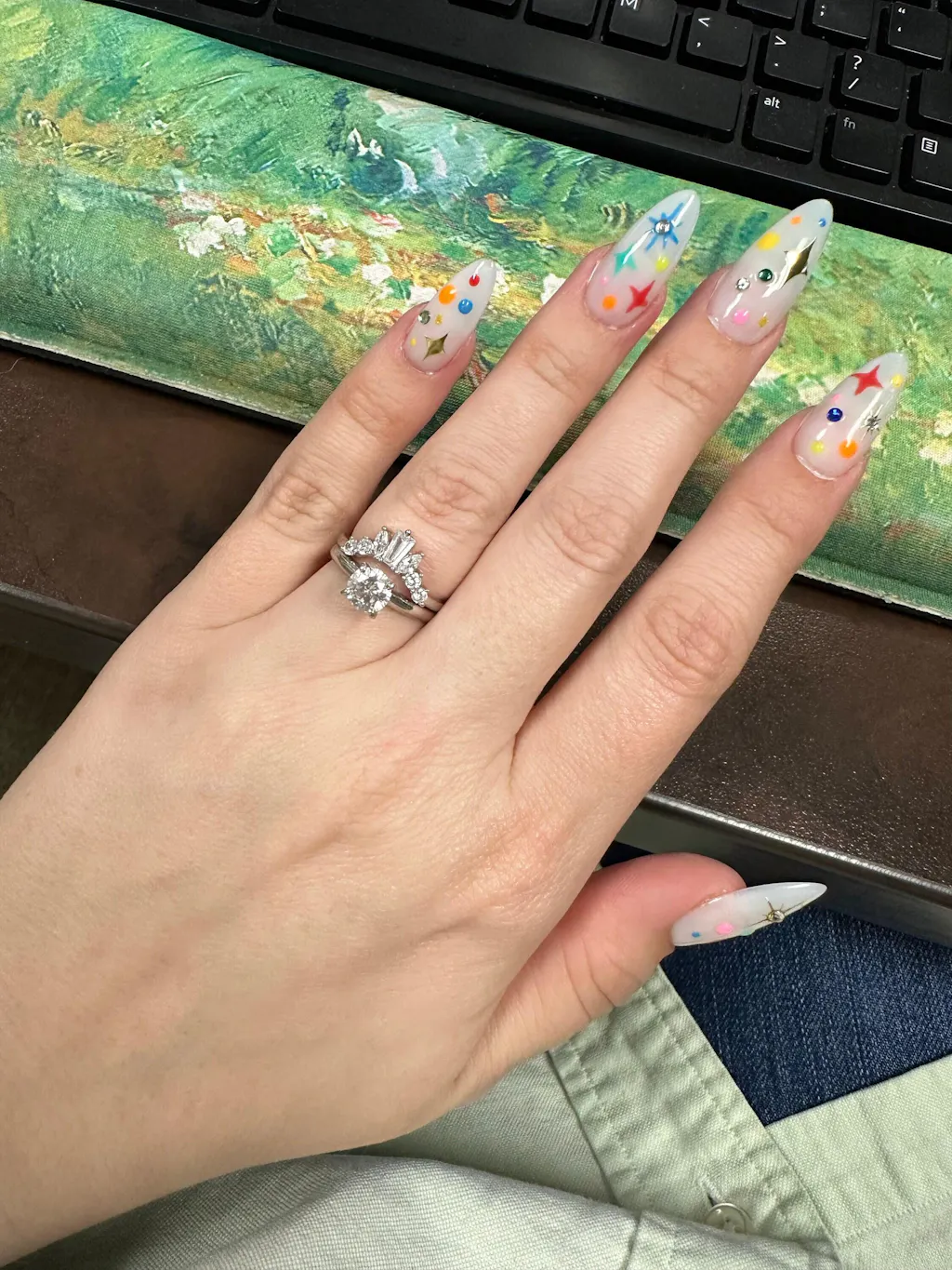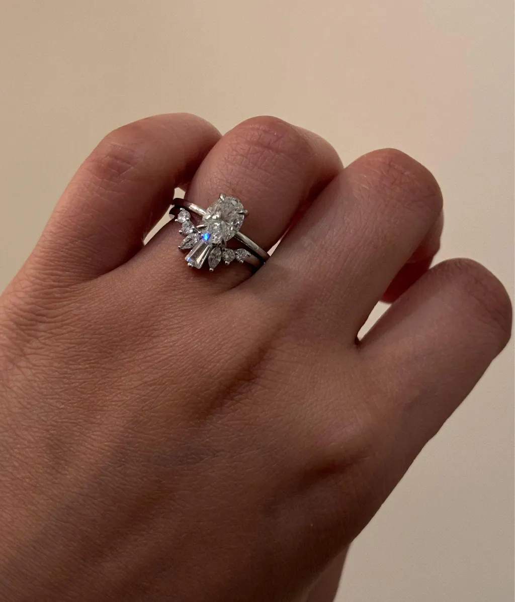 Beautiful ring that’s a perfect addition to a stack. May fit better with a larger stone or a different cut opposed to my oval diamond. Still, very pretty and sparkly and can be worn alone and still looks great!