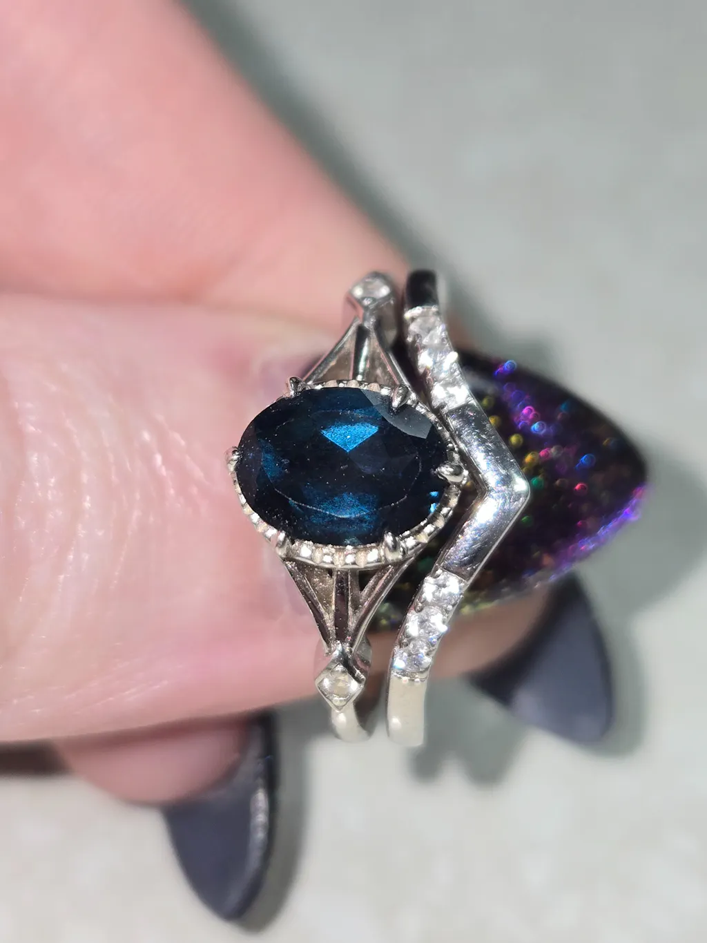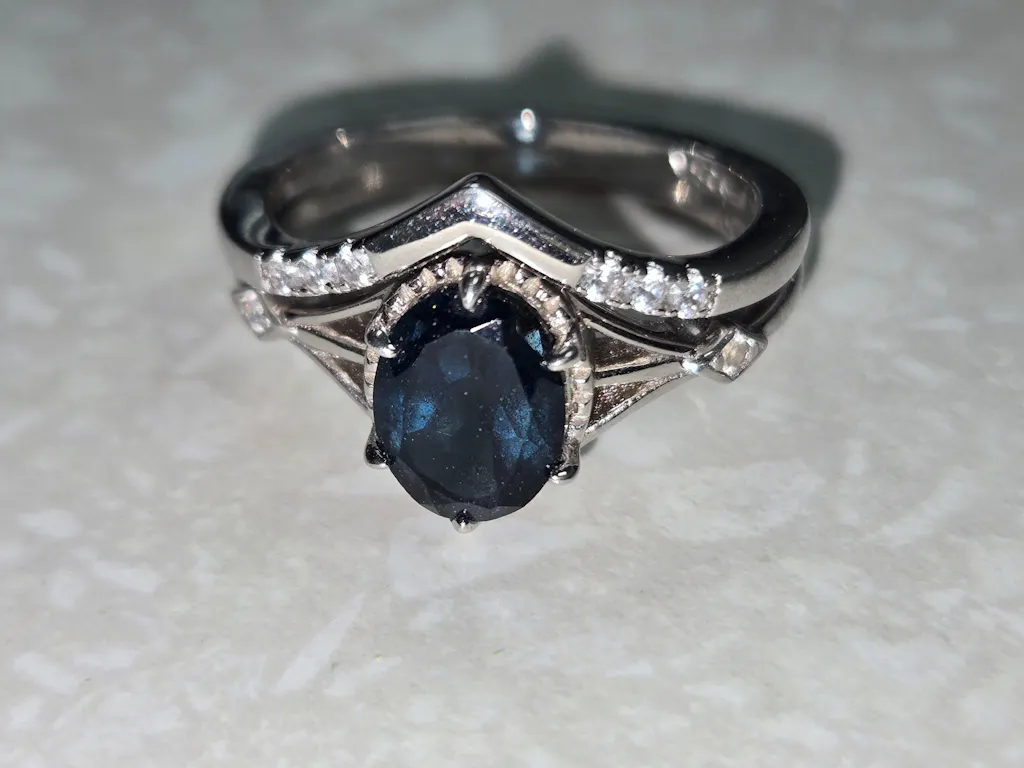There is so many words for this beautiful gorgeous ring set it is beyond approach if you're looking for a mixture of a midnight blue and a sapphire blue sapphire this is the perfect thing for you The pictures do not do this ring set justice even the pictures on here it is gorgeous it is shiny it is flattering it's dainty it's just the perfect size for any small woman's hand it is comfortable to wear it's perfect size it is just gorgeous there's so many words but not enough time to describe everything on this.