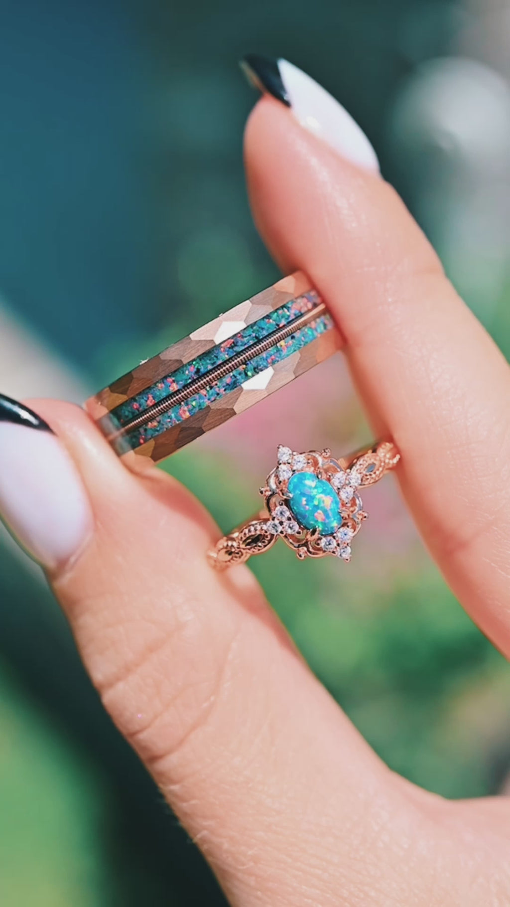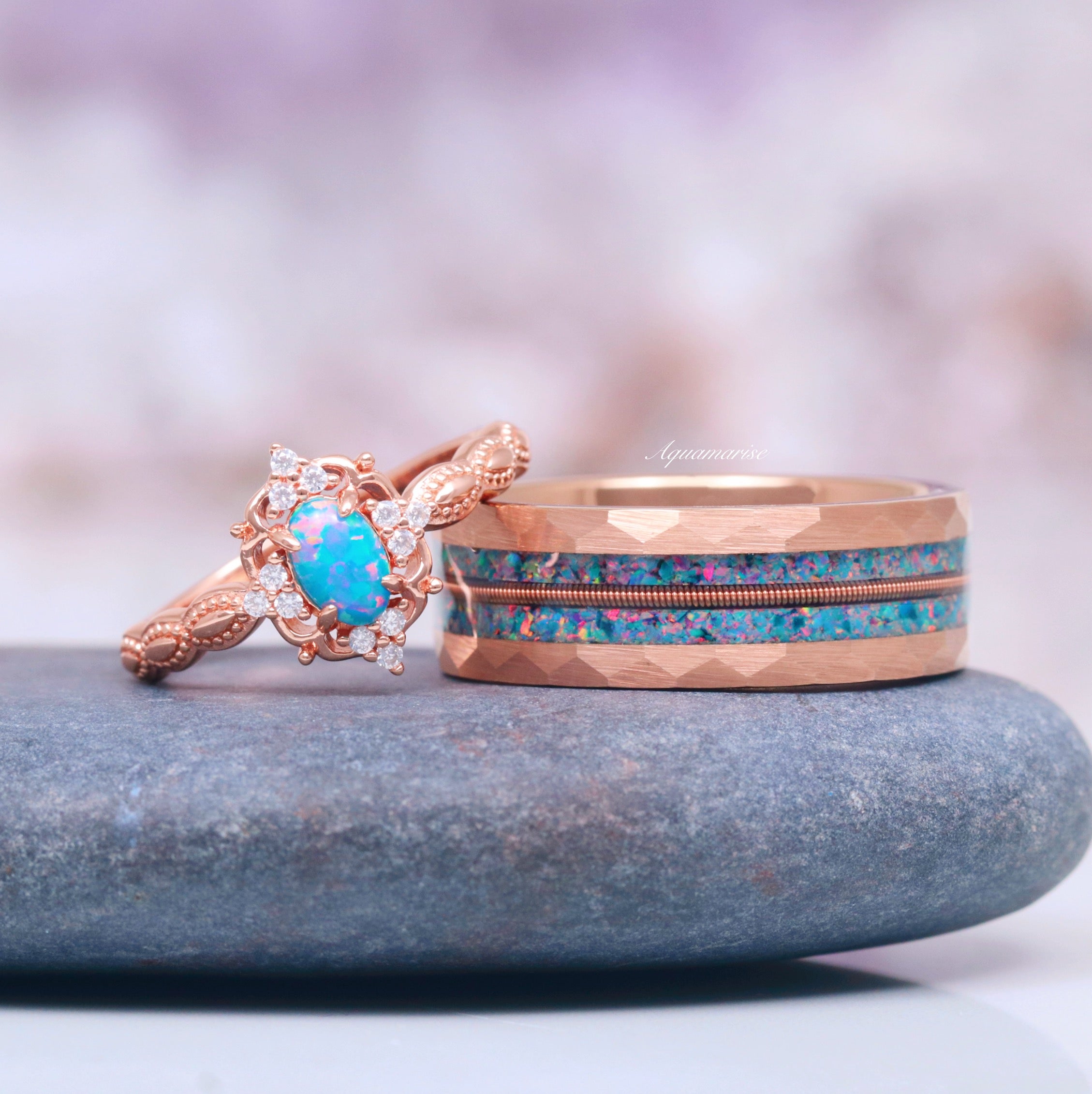 ►Elevate your style with this striking Blue Fire Opal & Guitar String Men's Wedding Band. Crafted with an 8mm rose gold hammered tungsten carbide band, this ring seamlessly blends rugged durability with sophisticated elegance. The mesmerizing blue fire opal inlay, complemented by a unique guitar string detail, creates a one-of-a-kind design perfect for music lovers and those who appreciate distinctive jewelry.