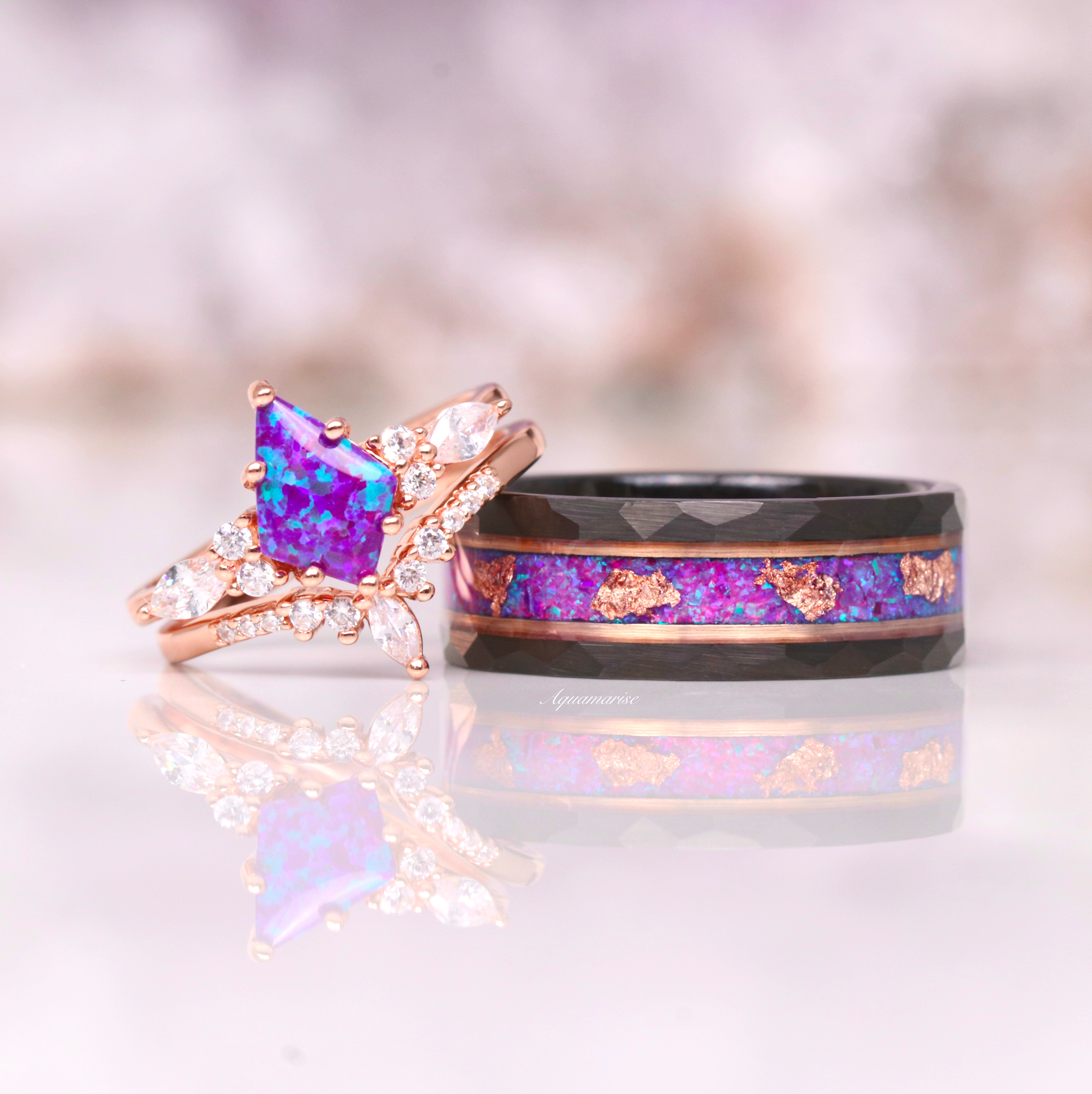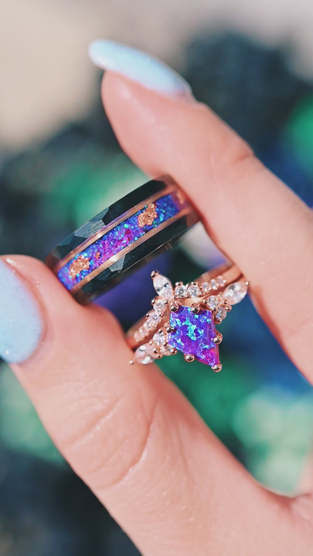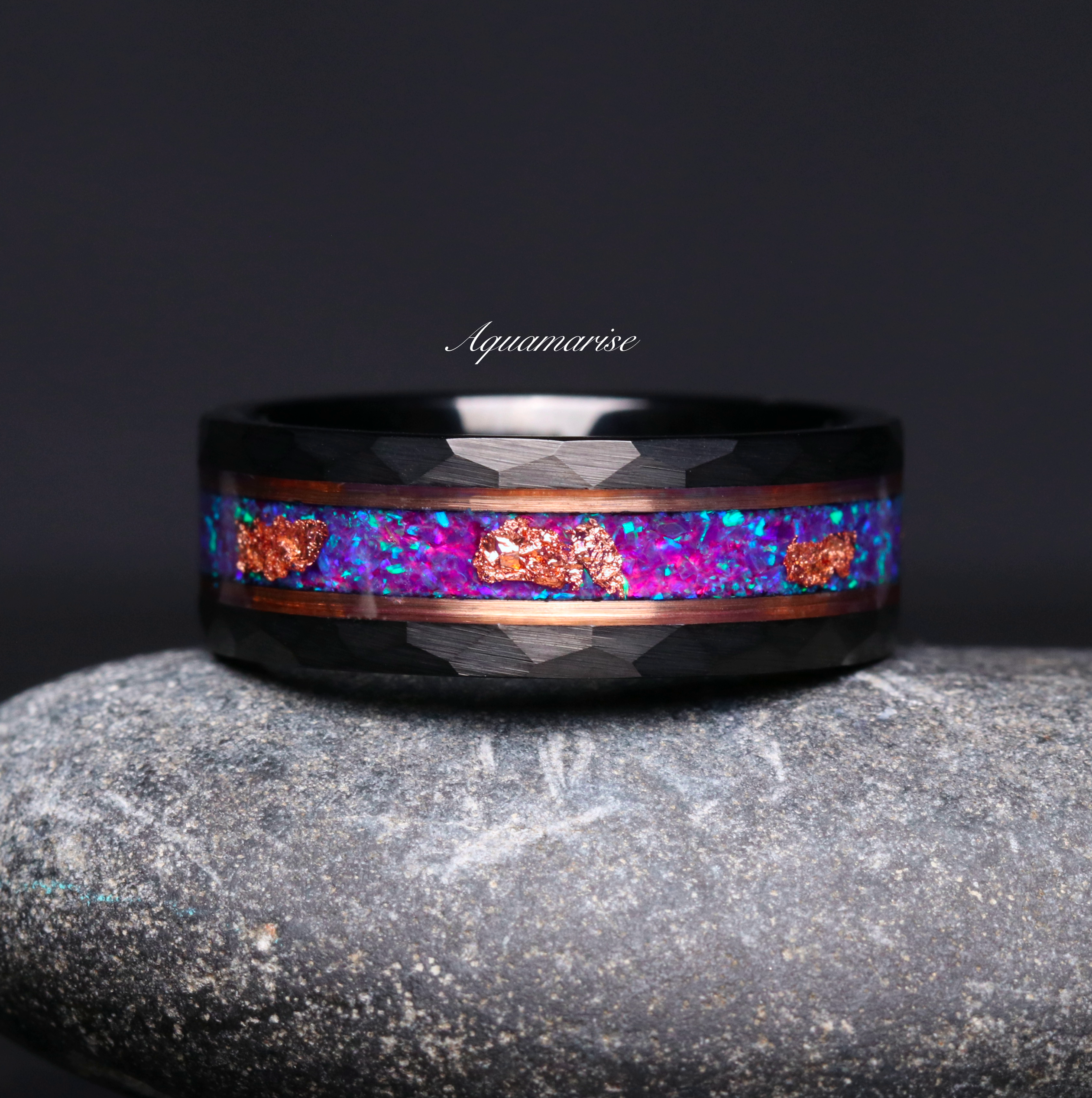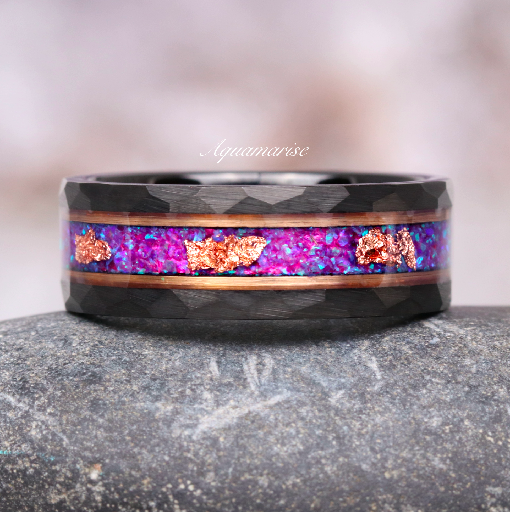 Purple Fire Opal & Rose Gold Leaf Band - 8MM Black Tungsten Carbide