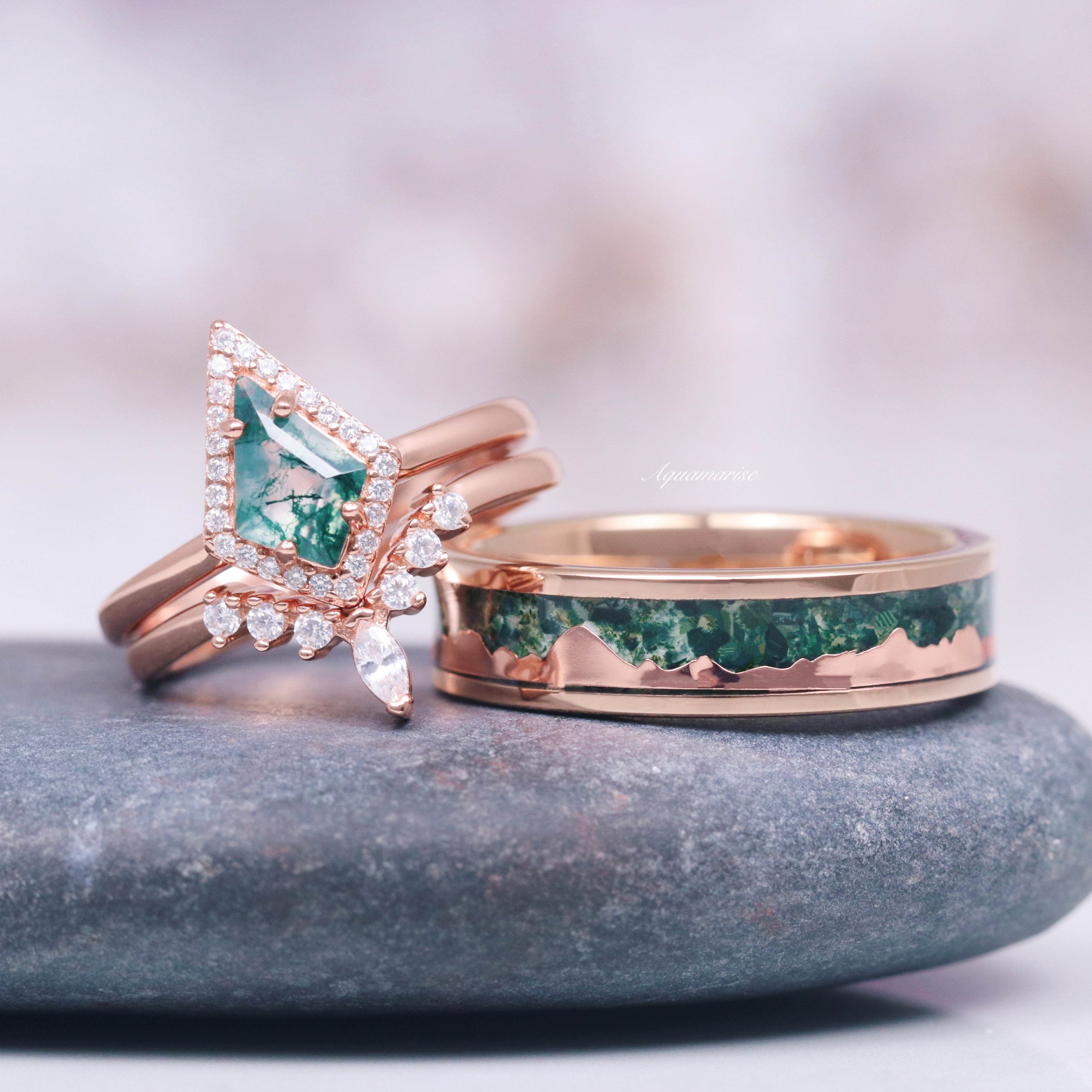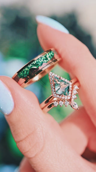 ►Inlay: The green moss agate inlay is the highlight of this wedding band. Its green hues add a natural and earthy touch to the ring, making it truly one-of-a-kind.