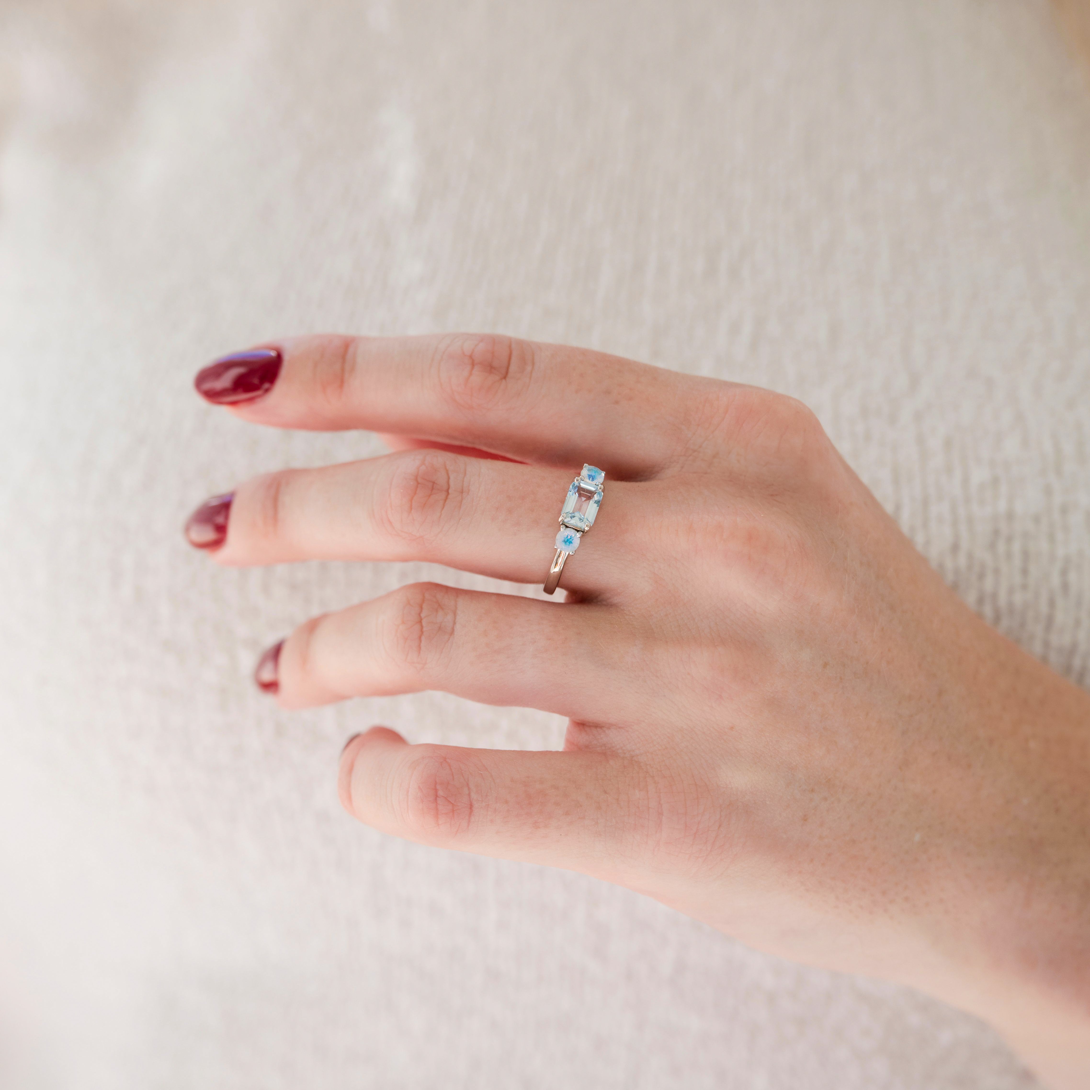 This elegant three-stone ring captures the harmony between calm, ocean-blue Aquamarine and luminous Moonstone in a minimalist sterling silver design. Thoughtfully crafted for women who appreciate understated sophistication, it embodies both timeless beauty and celestial allure.