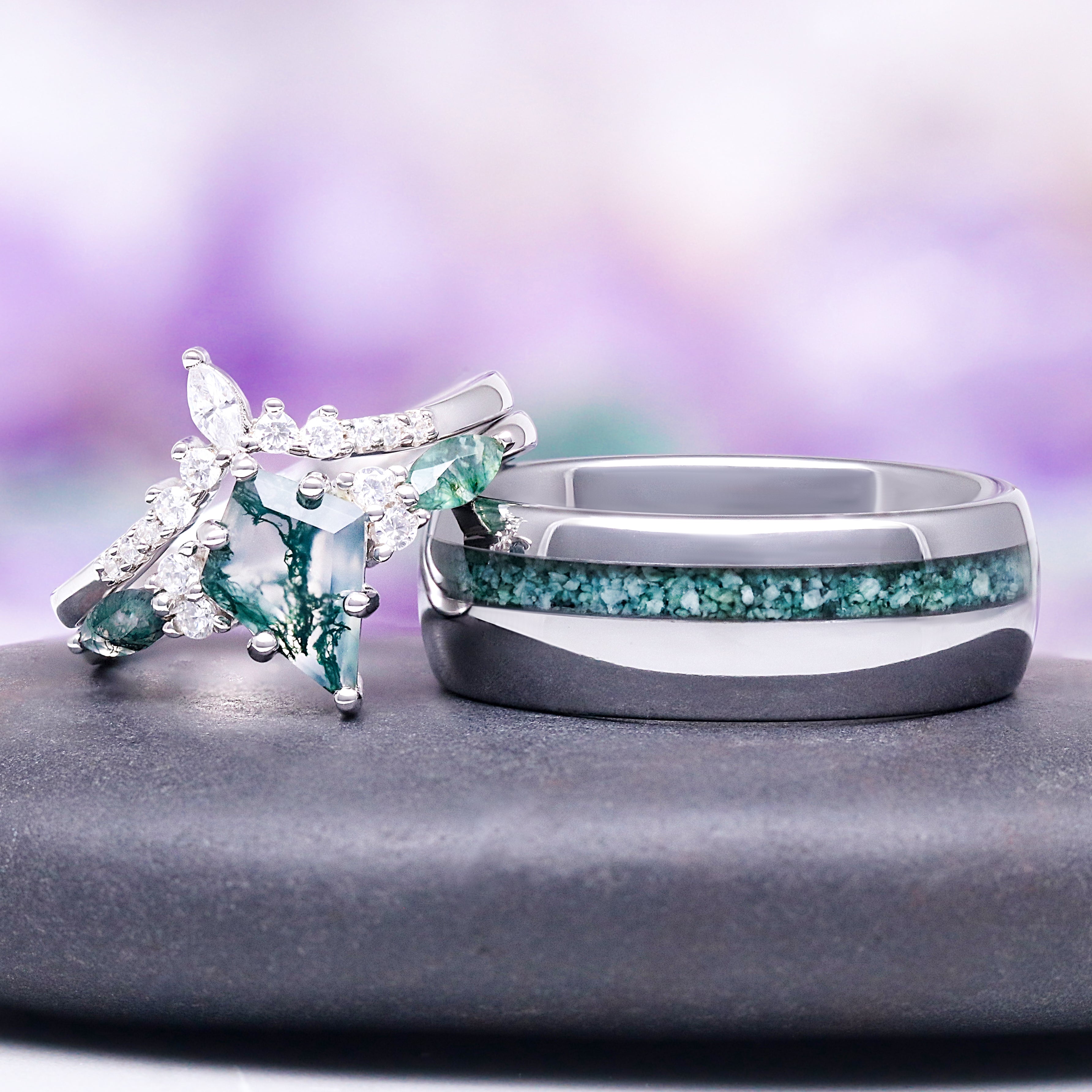 Embrace nature’s elegance with our Skye Kite™ Green Moss Agate Engagement Ring Set, meticulously handcrafted in 14K solid white gold. This captivating design celebrates natural beauty with a genuine moss agate gemstone, each featuring unique green inclusions that evoke tranquil forest landscapes. The signature kite-cut center stone reflects light beautifully, symbolizing harmony, growth, and timeless love.