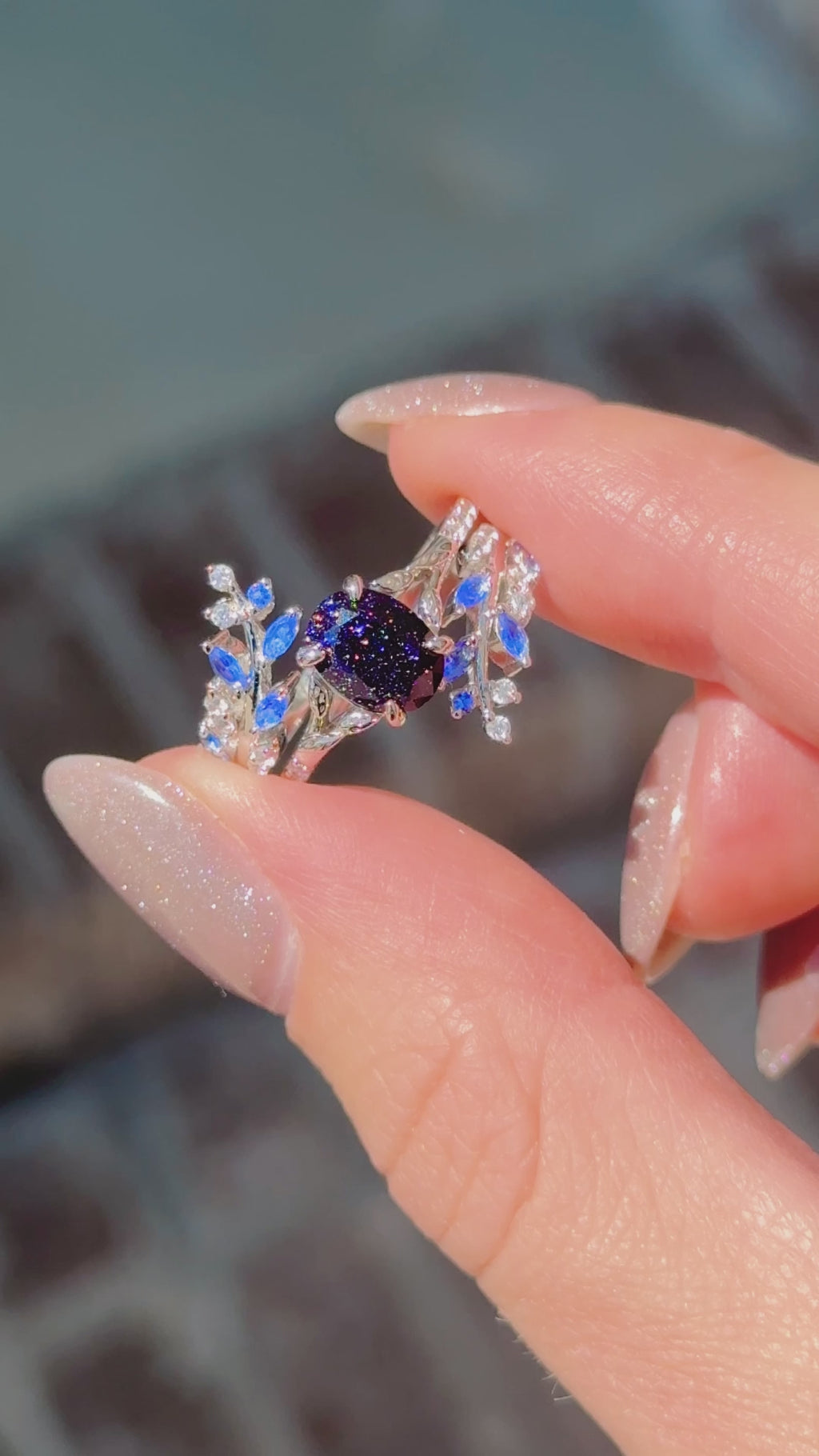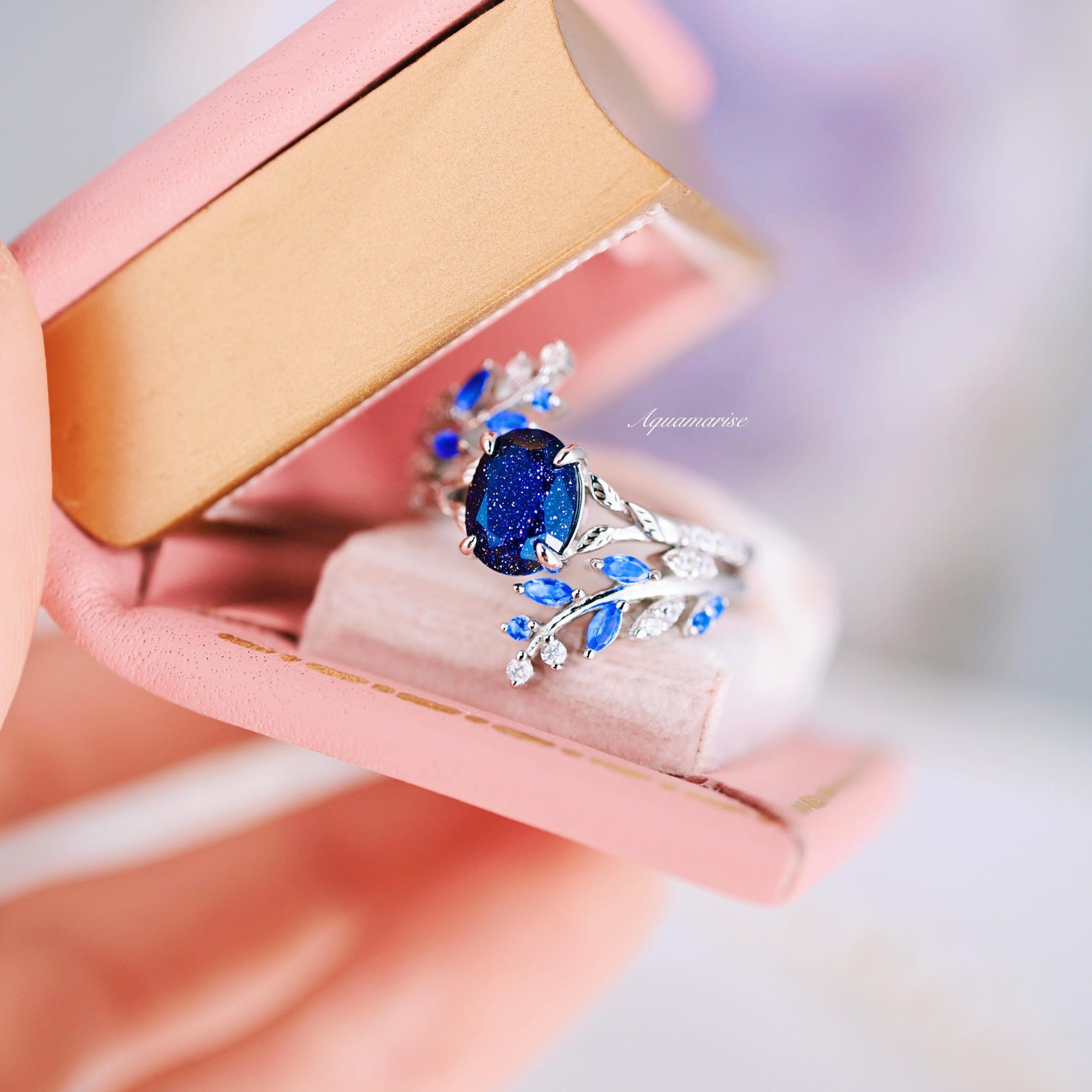 Starry Night & Sapphire Leaf Engagement Ring Set- Sterling Silver